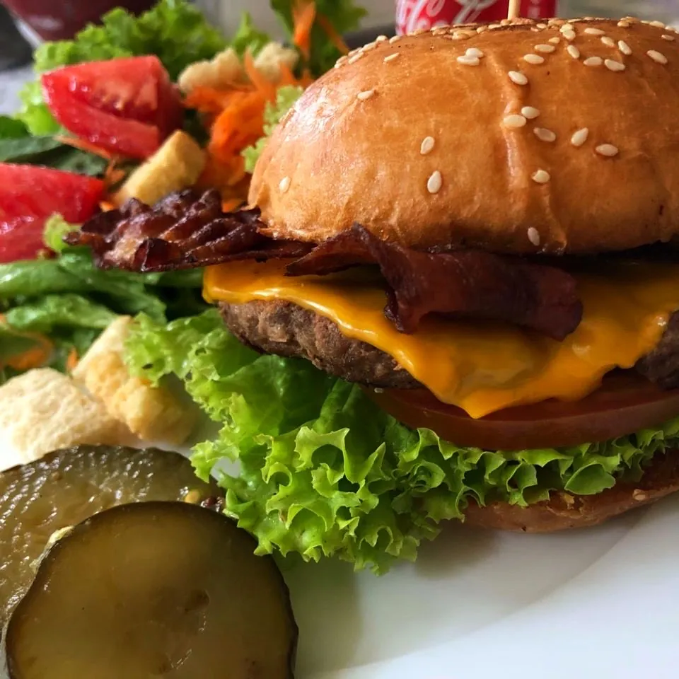 ¡Sabor auténtico en cada mordisco! Disfruta nuestra Bacon Cheeseburger con ingredientes frescos y caseros de Shaw’s. Acompáñala con ensalada de papas, ensalada verde o chips. ¡Una delicia para el paladar! Pídela a cualquier día en Shaw’s.