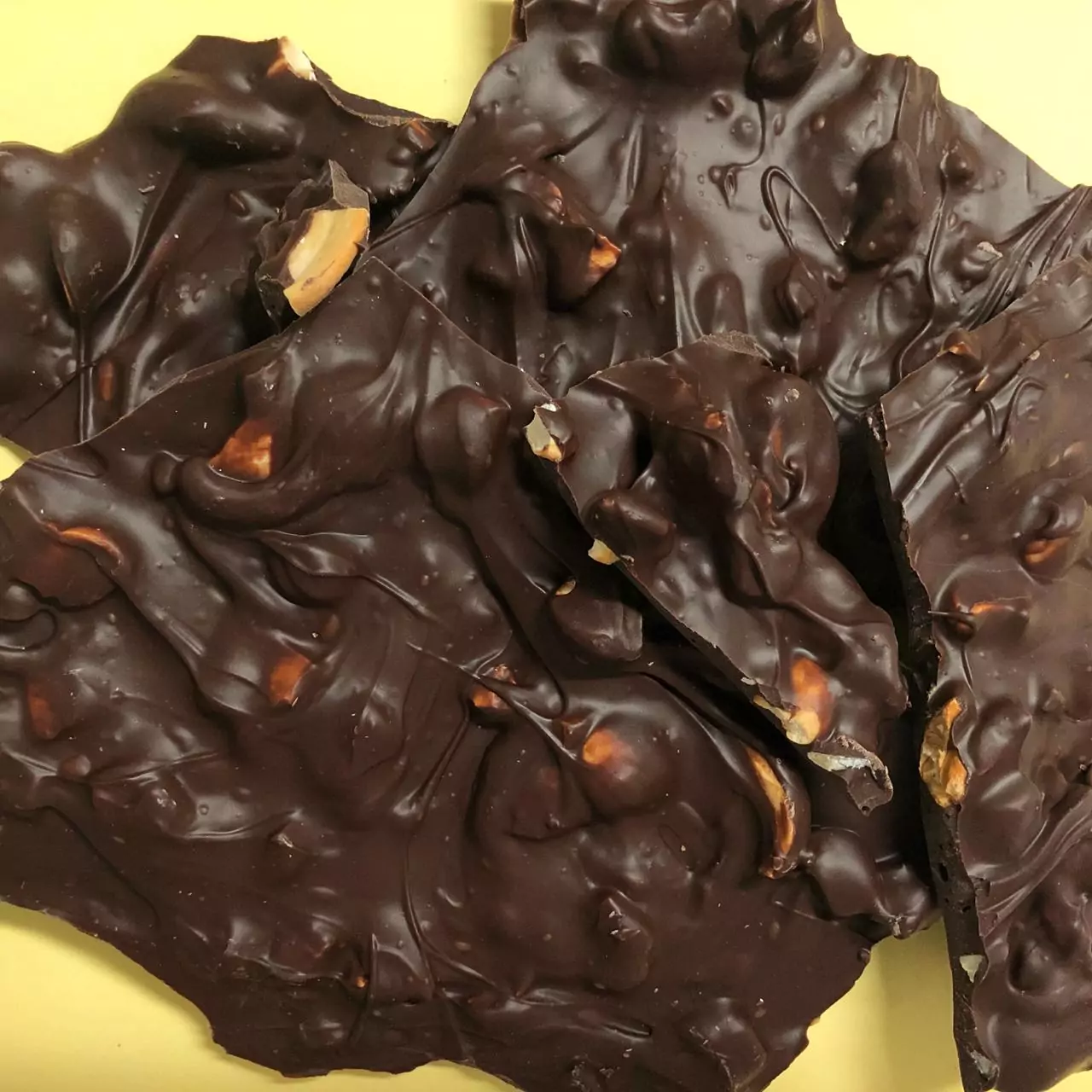 Bark de chocolate oscuro con marañones.🥜 🍫 El chocolate oscuro tiene muchos antioxidantes, es antidepresivo, promueve el flujo adecuado de sangre, ayuda a disminuir la presión arterial y a mejorar la circulación, ayuda a la memoria, y muchos beneficios más.🍫 Los marañones también tienen muchas propiedades como vitamina B1, B2, E, fibra, proteínas, fortifica la memoria y ser excelente para disminuir algunos trastornos renales, y muchos otras bondades para tu cuerpo. 🌿 Es una super combinación. 🍫 De la semilla del cacao Mesoamericano a tu paladar…🌿