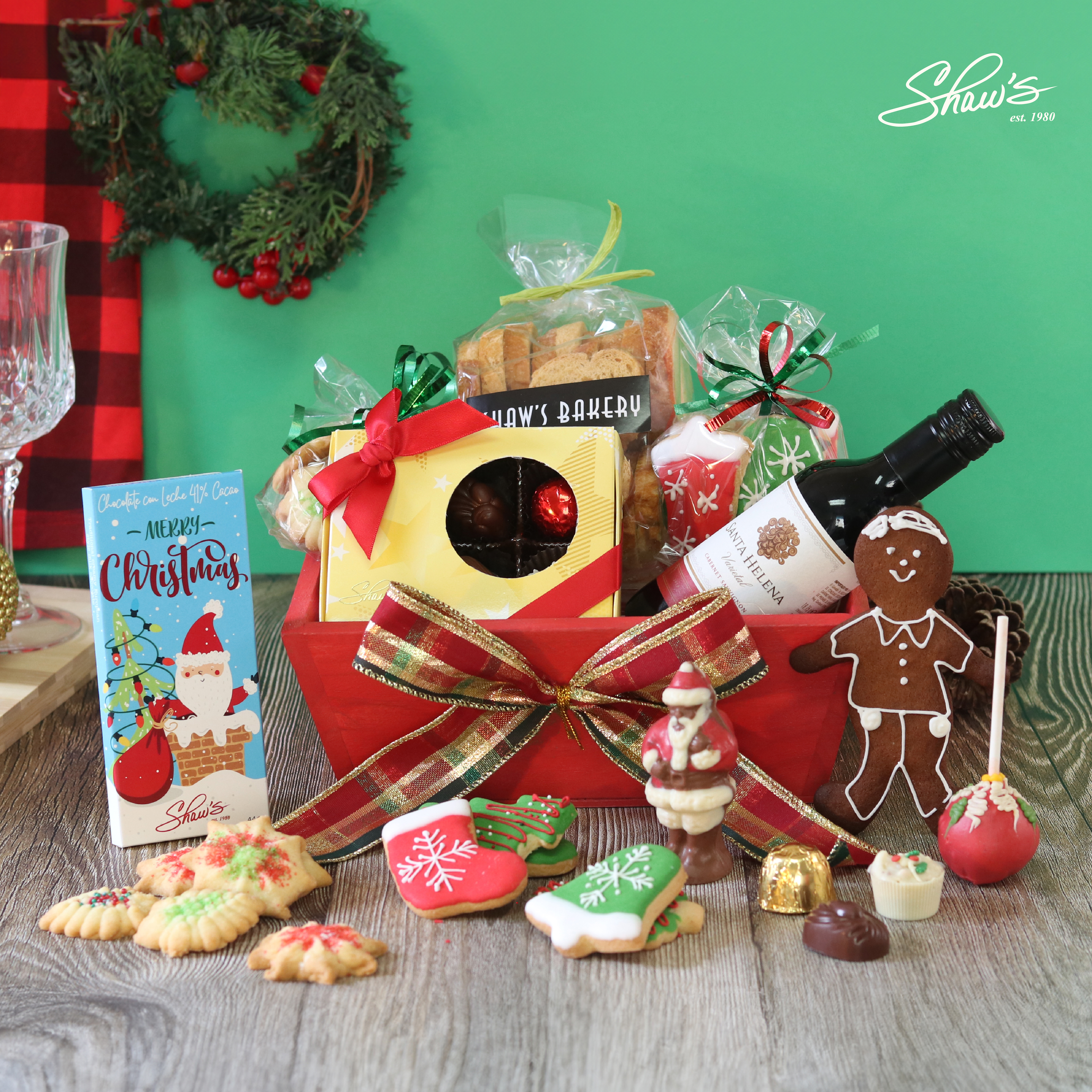 Blitzen – Canasta Navideña ⭐La canasta incluye: • Barra de chocolate con leche 41% cacao • Brownie pop • Crostini • Galletas Spritz • Vino tinto pequeño • Caja pequeña de truffles y bombones (de chocolate blanco 30%, chocolate con leche 41% y oscuro 51% cacao) • Galletas navideñas de vainilla • Galleta de jengibre • Santa Claus pequeño de chocolate • Base de madera.