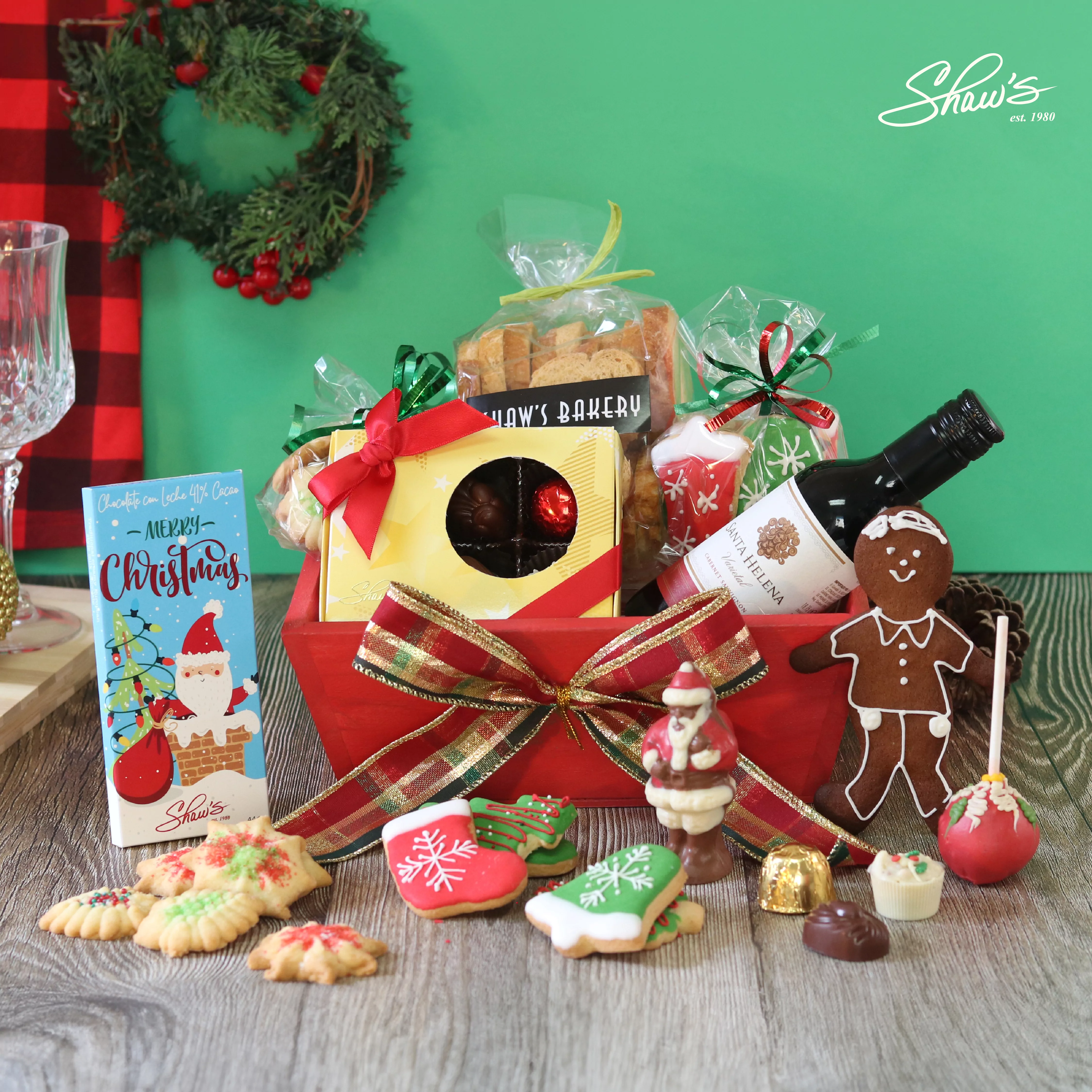 Blitzen – Canasta Navideña ⭐La canasta incluye: • Barra de chocolate con leche 41% cacao • Brownie pop • Crostini • Galletas Spritz • Vino tinto pequeño • Caja pequeña de truffles y bombones (de chocolate blanco 30%, chocolate con leche 41% y oscuro 51% cacao) • Galletas navideñas de vainilla • Galleta de jengibre • Santa Claus pequeño de chocolate • Base de madera.