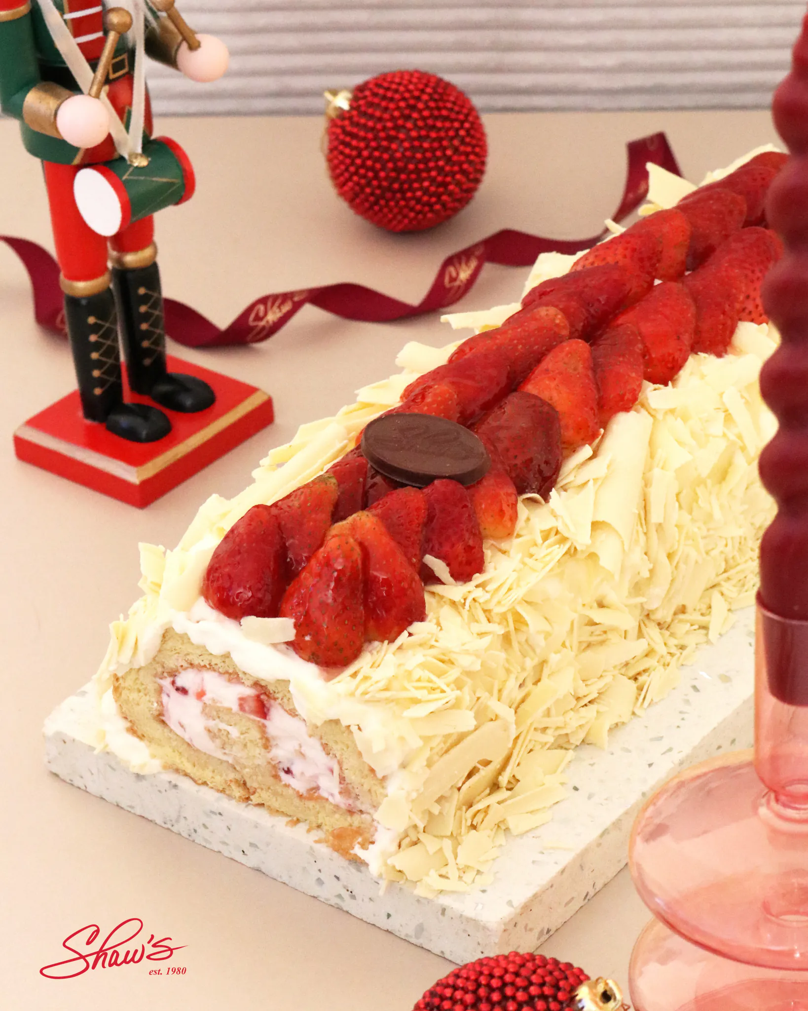 Brindemos por la magia de la Navidad con delicioso Brazo gitano de fresas relleno de fresas con crema chantilly, con chocolate blanco por fuera y decorado con fresas frescas y Fantasía de Fruta.🎄✨🍰🍫Pasteles de temporada disponibles en Shaw’s del 22 al 24 de Dic. Haz tu pedido en nuestro Shaw’s o nuestro website para la fecha que desees.