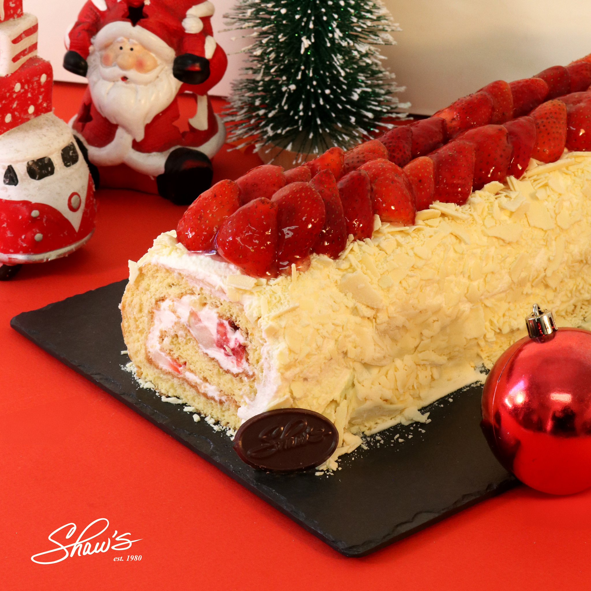 Disfruta de una explosión de placer navideño con nuestro brazo gitano de fresas y chocolate blanco: un verdadero deleite para estas fiestas.