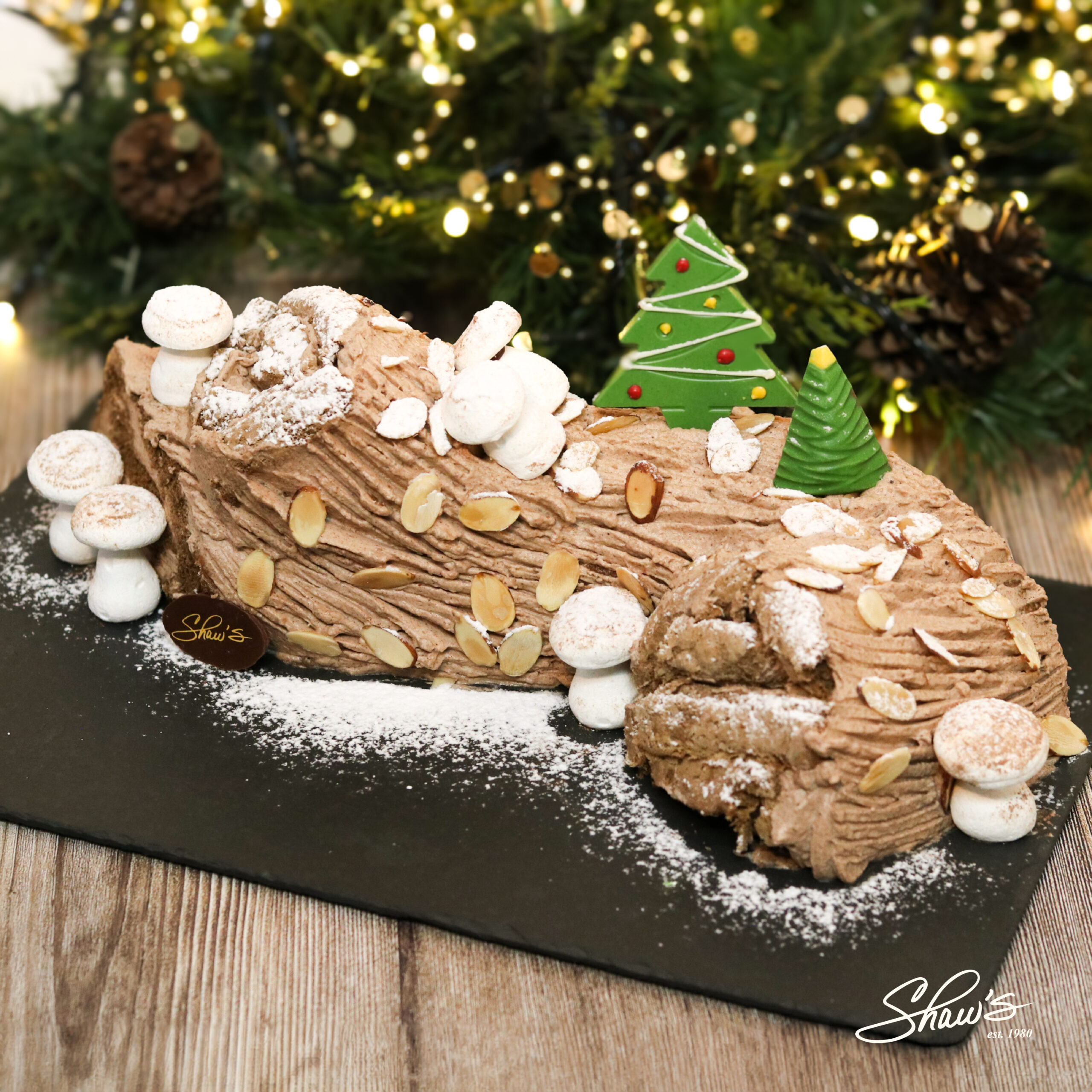 Bûche de Noël Delicado cake de chocolate relleno con mousse de chocolate, decorado con arbolitos navideños de chocolate, lascas de almendras y honguitos de merengue.