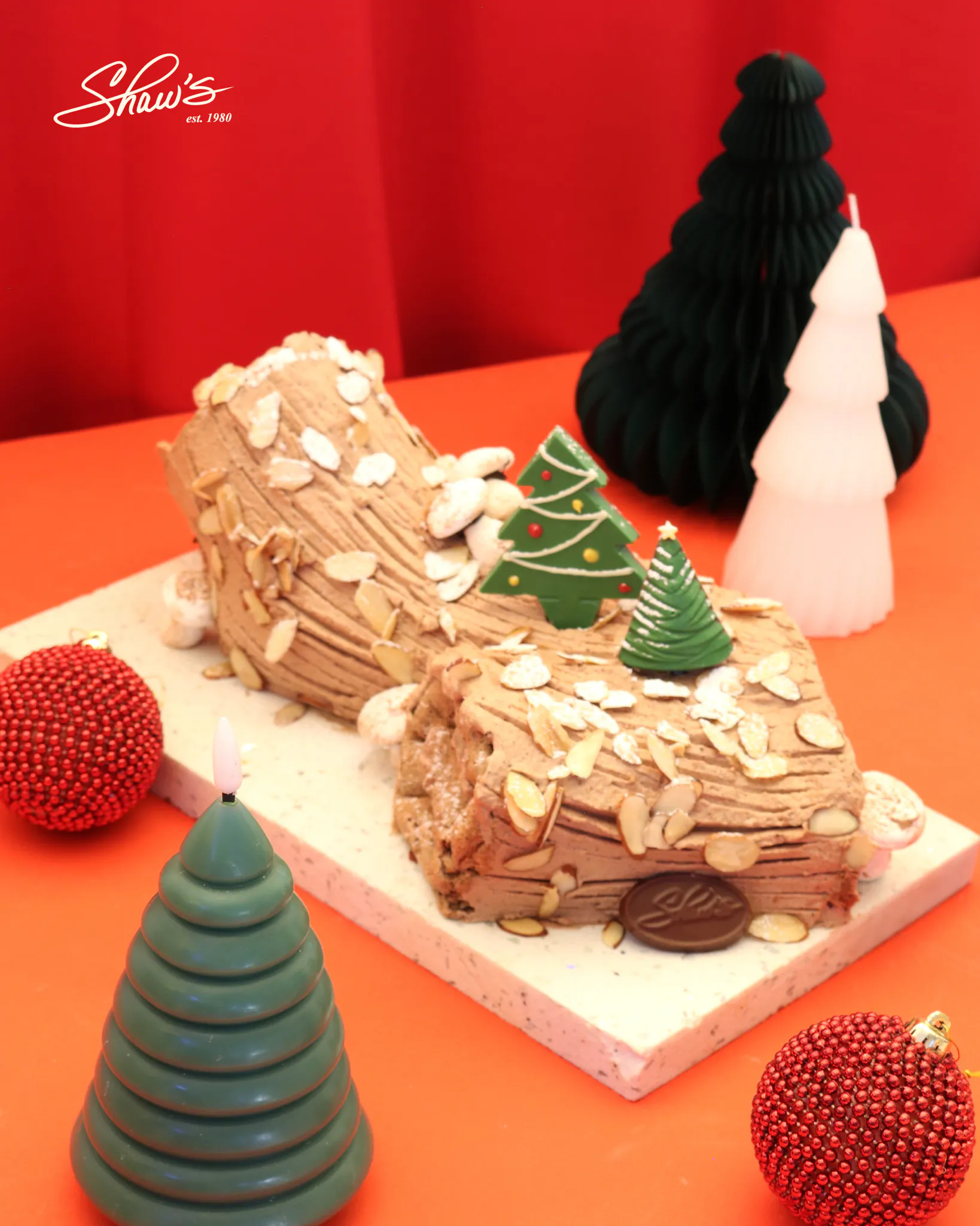 Bûche de Noël 🎄 Delicado tronco de chocolate relleno con mousse de chocolate, decorado con arbolitos navideños de chocolate, almendras y honguitos de merengue. Disponible en nuestro sitio web hasta hoy, o en Shaw’s en cantidades limitadas hasta el 24 de Dic.. ¡Haz ya tu pedido en línea! 🍫✨