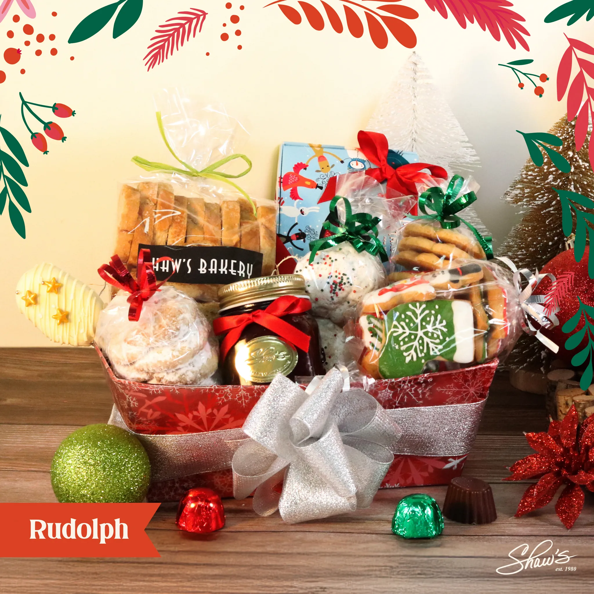¡Un regalo irresistible! La canasta Rudolph es solo por pedido especial en Shaw’s o nuestro website, e incluye: • Brownie pop. • Crescents de nueces. • Crostini. • Caja pequeña de truffles y bombones (de chocolate blanco, chocolate con leche y oscuro cacao). • Galletas navideñas de vainilla. • Galletas Spritz. • ChocoMacaroons. • Mermelada de Fresa. • Caja Navideña.