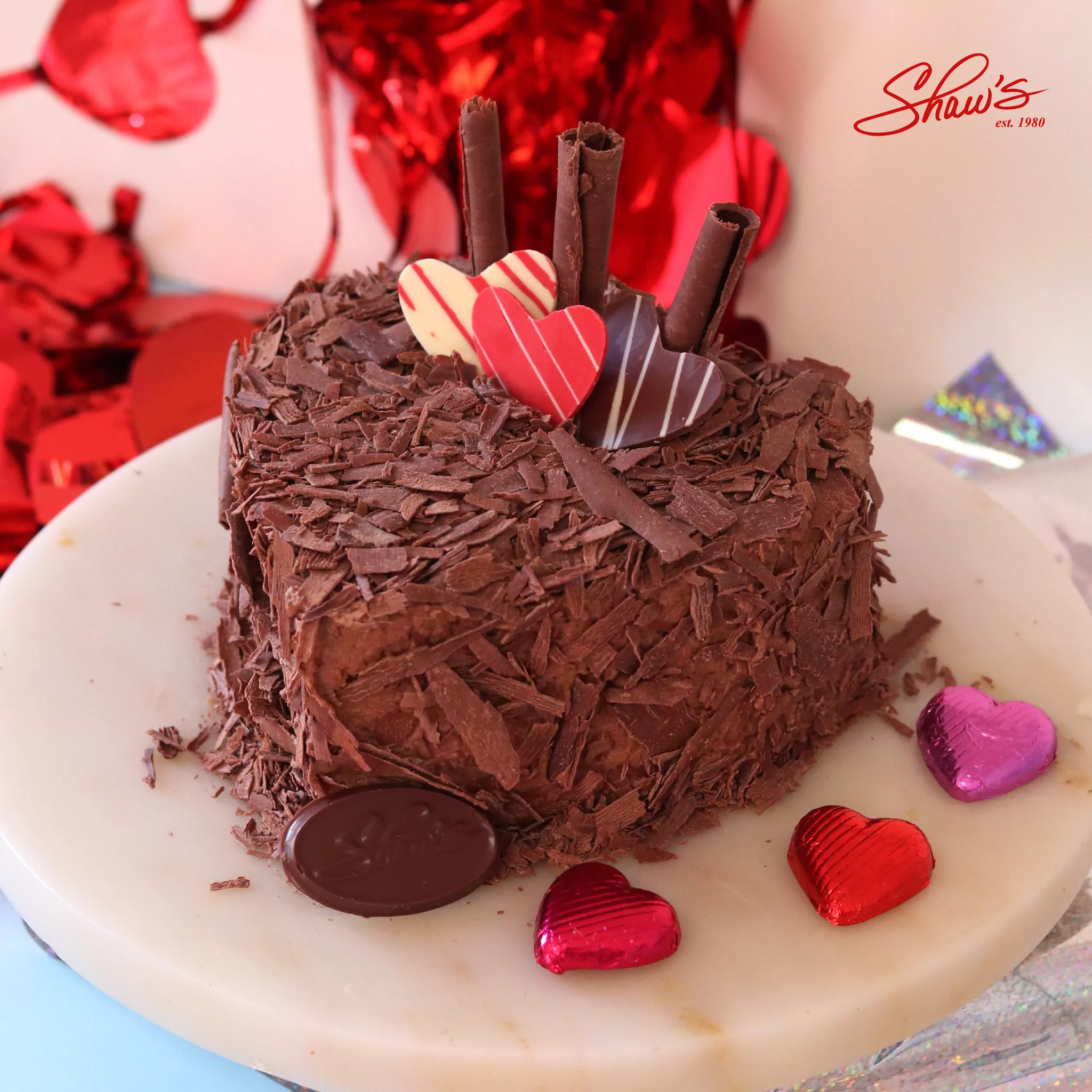 Chocolate Mousse cake Pastelito de torta de chocolate en forma de corazón, relleno y cobertura con mousse de chocolate con granizo de chocolate oscuro, decorado con corazones de chocolate. From bean to cake!