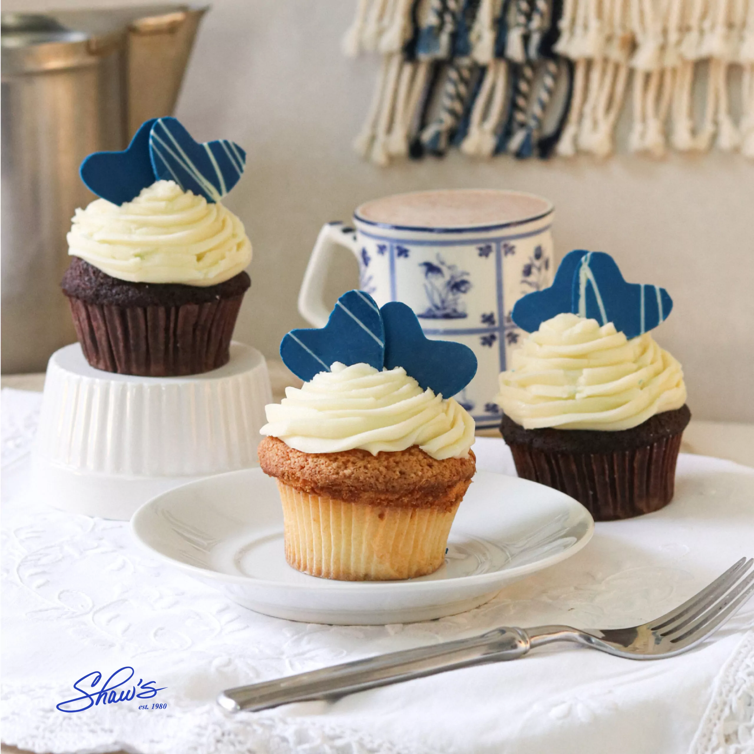 Cupcakes alusivos a los colores de nuestra Bandera Nacional. Haz tu pedido de Cupcakes de vainilla o chocolate con decoración corazones azules de chocolate, en Shaw’s o nuestro website.