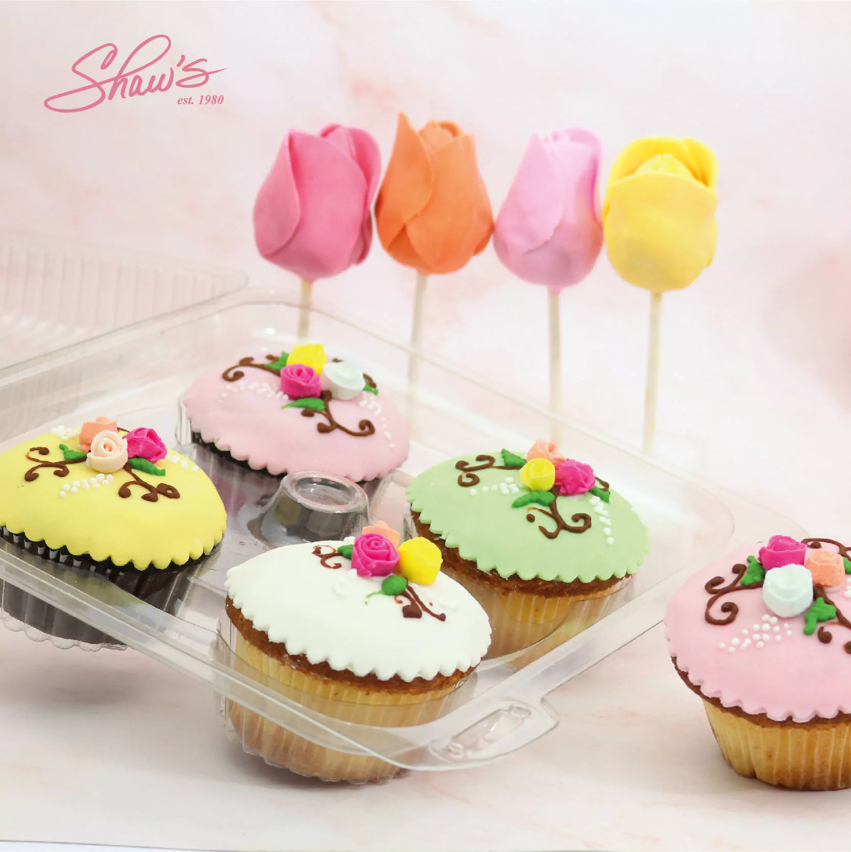 Cupcakes florales de chocolate y vainilla decorados con fondant y florcitas de azúcar. 🧁 Rose Brownie Pops, bolitas de nuestro brownie especial recubiertas en chocolate oscuro, decoradas como rosas, con pétalos de tonos primaverales.❣️