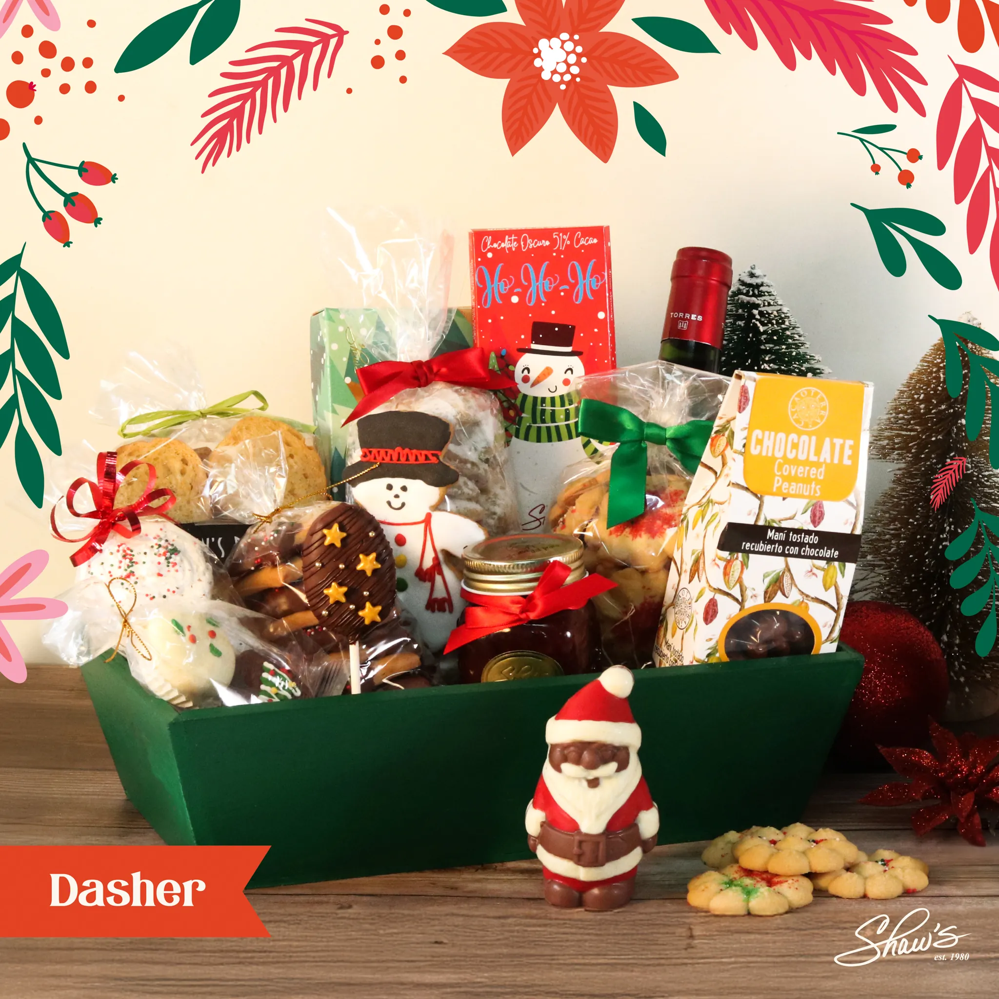 ✨Regala detalles hechos localmente en Navidad. La canasta Dasher es solo por pedido especial en Shaw’s o nuestro website, e incluye: • Maní recubierto de chocolate; • Brownie pop; • Caja mediana de truffles y bombones (de chocolate blanco, chocolate con leche y oscuro cacao); • Crostini; • Galletas Spritz; • Dúo de Alfajorcitos con chocolate con leche y chocolate blanco; • Galletas de vainilla en forma de estrella con chocolate oscuro; • ChocoMacaroons; • Crescents de nueces; • Barra de chocolate con leche 41% cacao; • Santa Claus de chocolate; • Vino tinto mediano; • Galleta de vainilla; • Mermelada de fresa; • Base de madera.