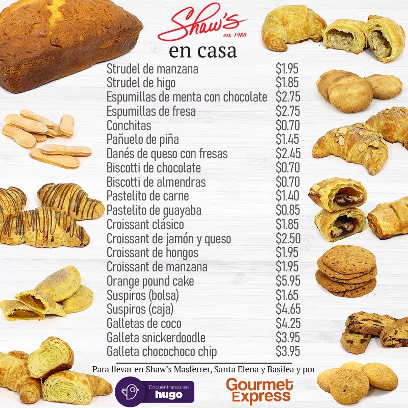 Delicias Shaw’s te acompañan en tiempos de cuarentena. 🥐Ordena el Pan que desees de Shaw’s con Gourmet Express o Hugo! 🍞 O llama y reservalo en lo que llegas a traerlo. 📱Shaw’s Santa Elena al 2275-9166. Shaw’s Bassilea al 2511-4251. Shaw’s Masferrer al 2263-4221.🥖🛵 Pan fresco en casa.