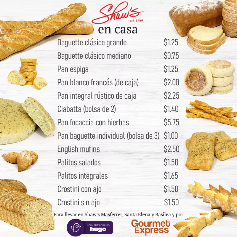Ordena el Pan que desees de Shaw’s con Gourmet Express o Hugo! 🍞 O llama y reservalo en lo que llegas a traerlo. 📱Shaw’s Santa Elena al 2275-9166. Shaw’s Bassilea al 2511-4251. Shaw’s Masferrer al 2263-4221.🥖🛵 Pan fresco en casa.
