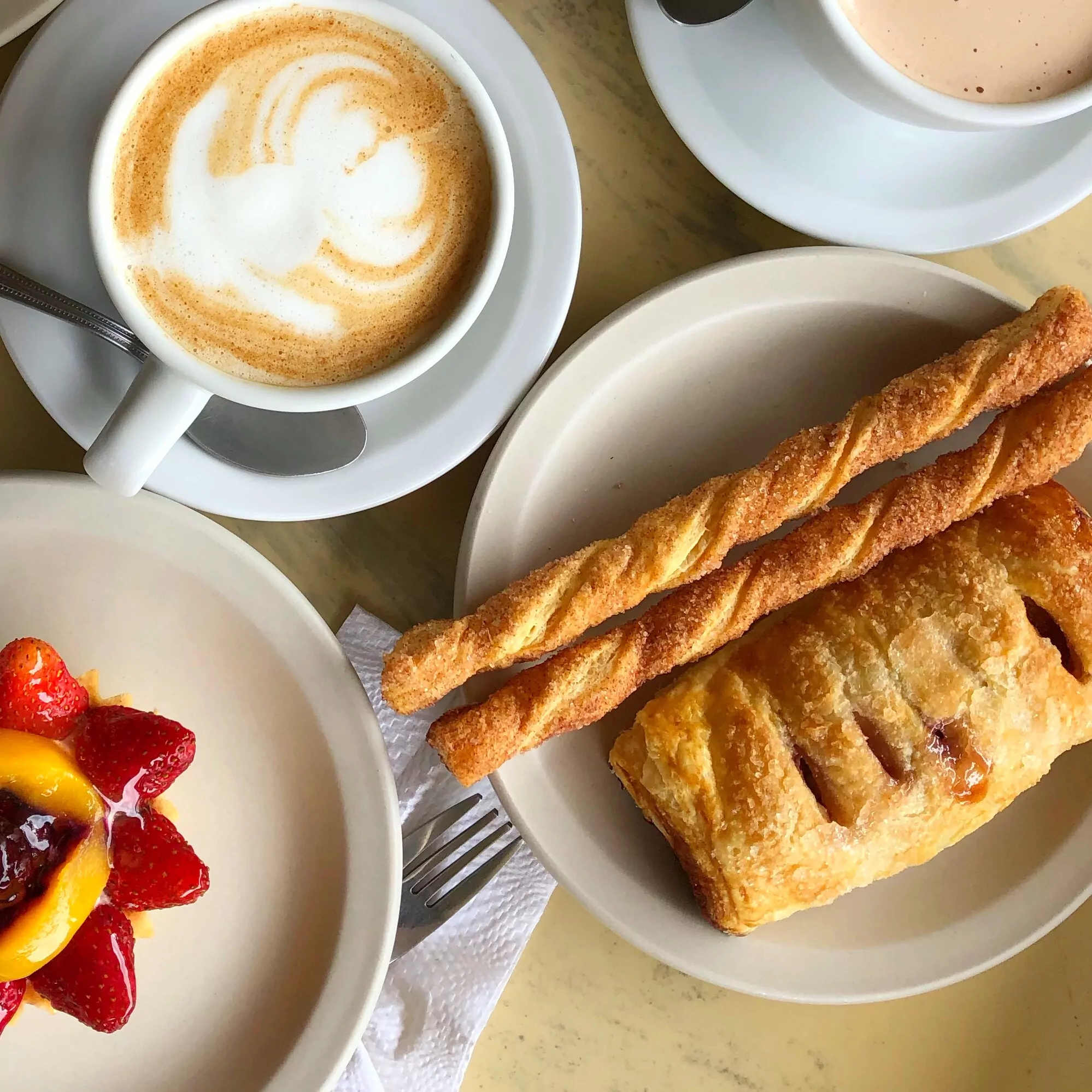 Dessert o’clock ⏰Ya es hora del postre, el momento favorito del día 😍 Danés de fresas con queso, palitos de hojaldre de canela, cocoa caliente, tartaleta festival de frutas, y cappuccino... es una fiesta para tu paladar, ¡es viernes! ☕️🍓🎉
