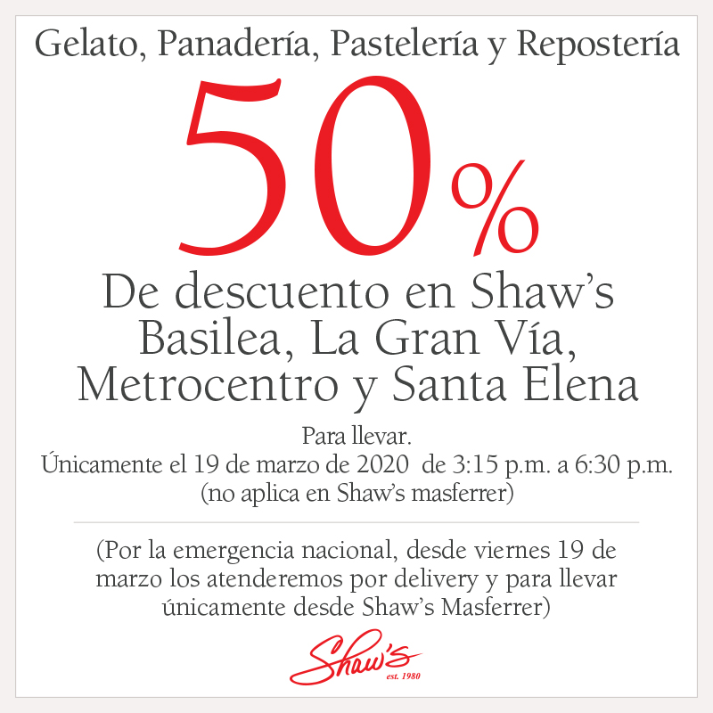 Tenemos 50% de descuento en Gelato Romano, Panadería, Pastelería y Repostería, en nuestras 4 sucursales ubicadas en centros comerciales. No aplica por delivery, sino solo para llevar. A partir de las 3:15pm a las 6:30pm, únicamente hoy.