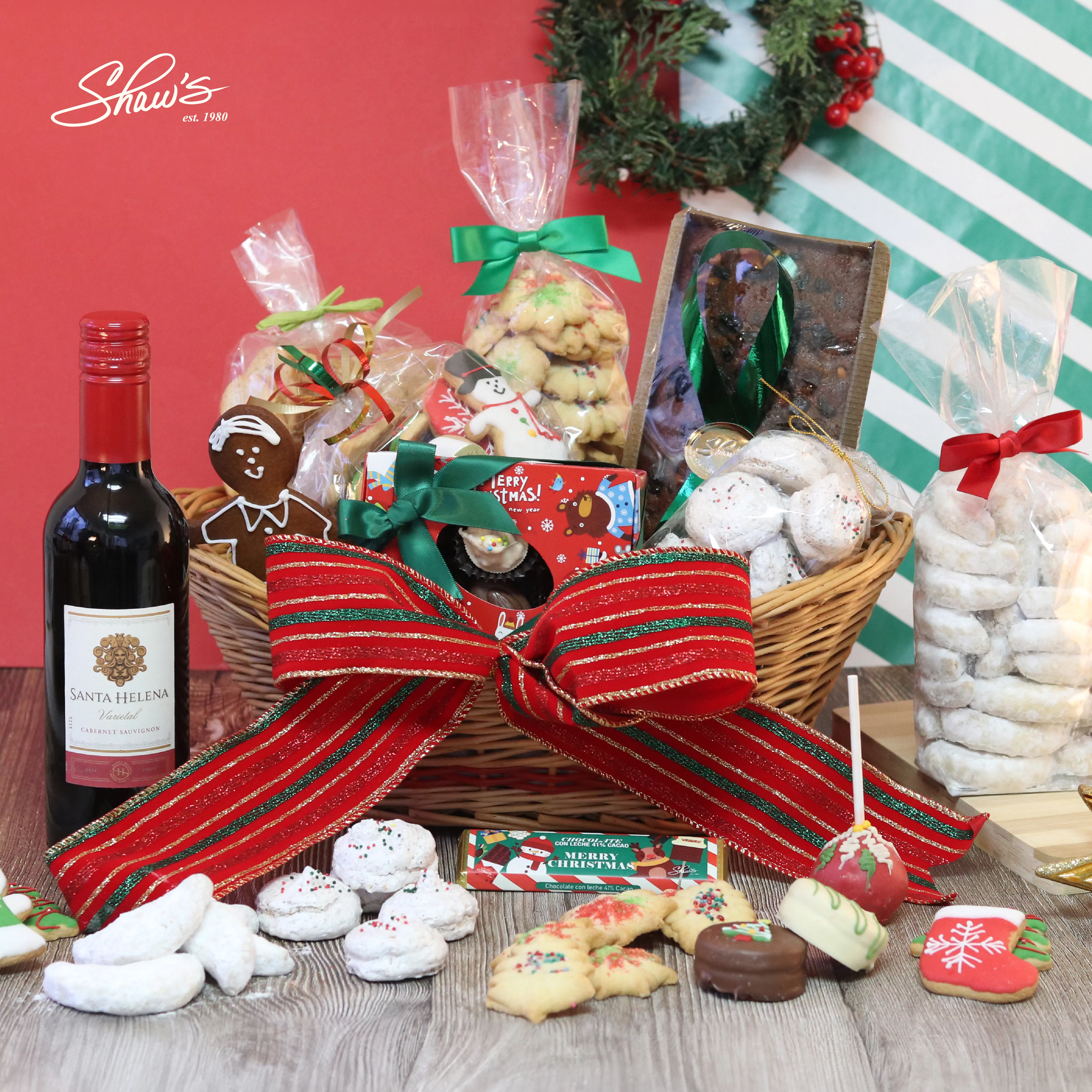 La canasta incluye: • Fruitcake • Barrita de chocolate con leche 41% cacao • Brownie pop • Caja pequeña de Truffles y Bombones (de Chocolate blanco 30% cacao, chocolate con leche 41% cacao y oscuro 51% cacao) • ChocoMacaroons • Crostini • Galleta de Jengibre • Galletas Spritz • Crescents de Nueces • Vino tinto mediano • Galletas de Vainilla navideñas • Duo de Alfajorcitos • Canasta.