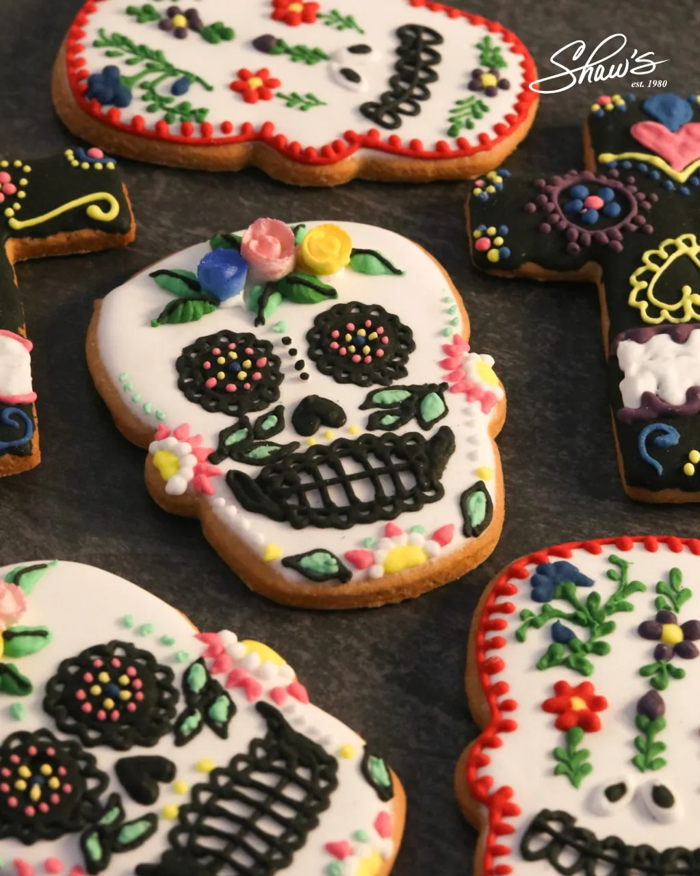 Dulces Calaveritas: Crujientes y hermosas galletas de vainilla decoradas con coloridas calacas. Perfectas para celebrar en el Festival Garibaldi. ¡Ven por las tuyas!