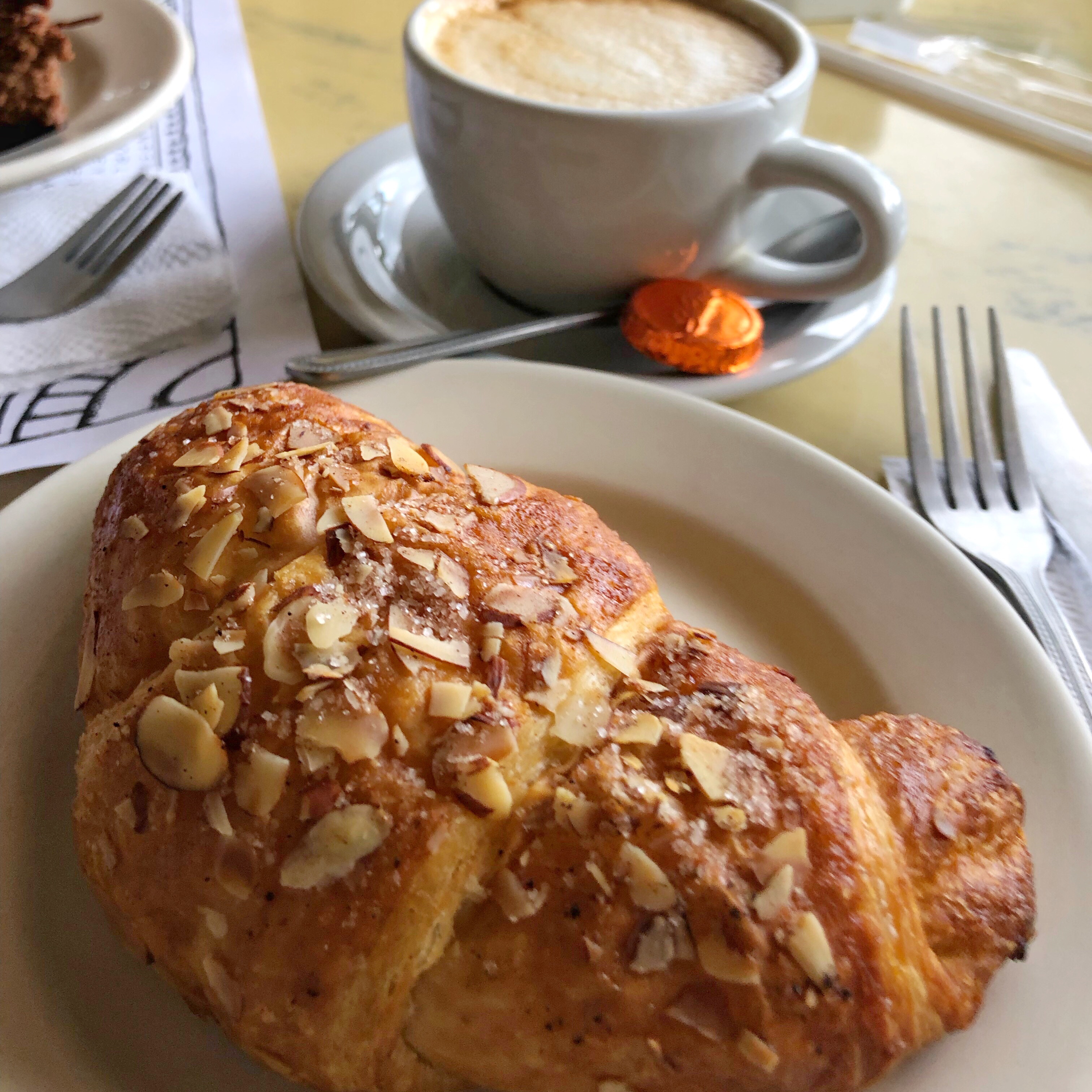 Sábado es hora de relajarse! 💆🏻♀️Croissant de manzana con almendras y canela, acompañado de cappuccino (y la monedita de chocolate)! ❤️🥐🍏☕️