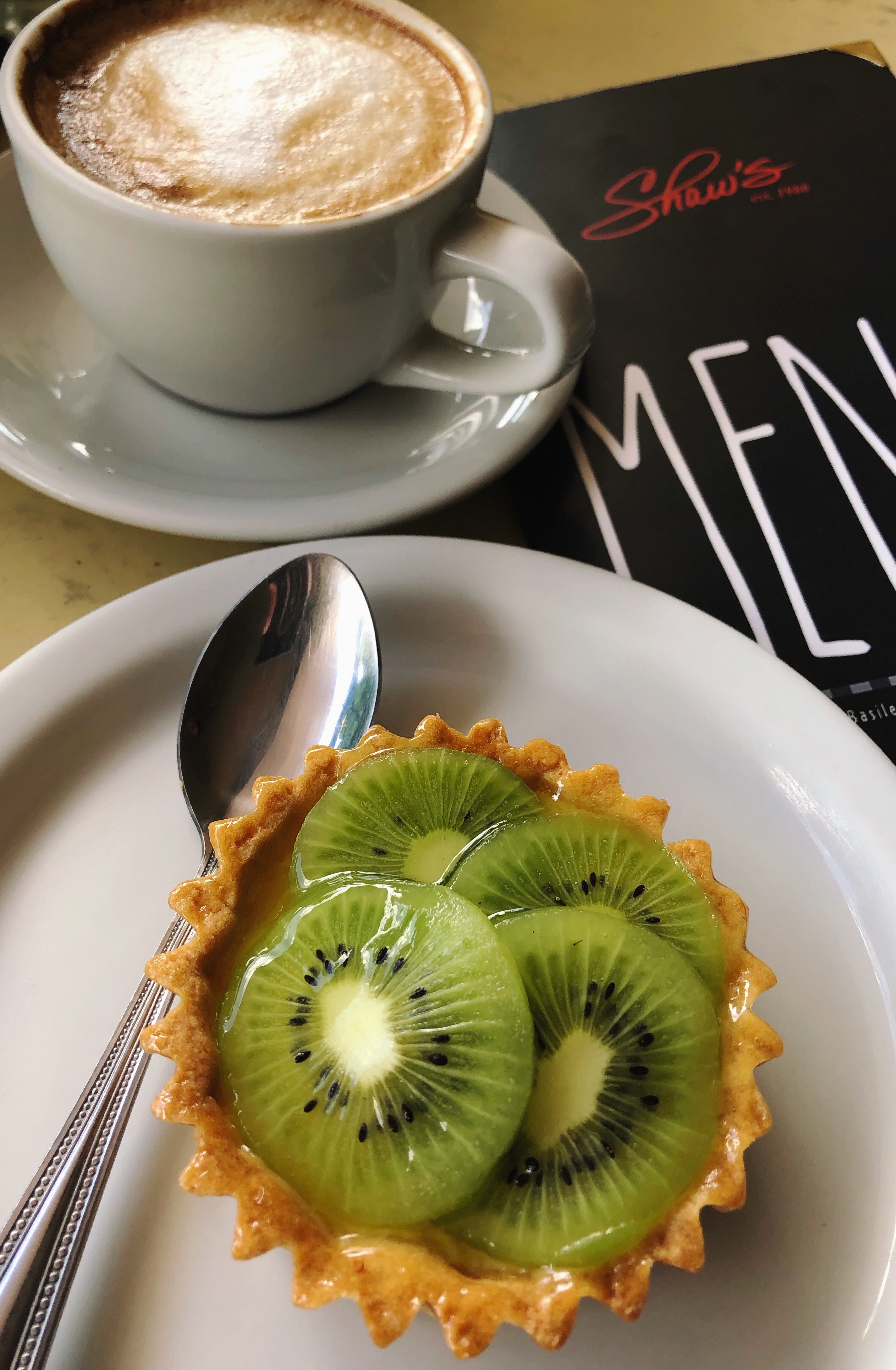 😌☕️🥝 Felicidad es recibir el inicio del fin de semana con una Tartaleta de Kiwi con relleno de melocotón y cappuccino!