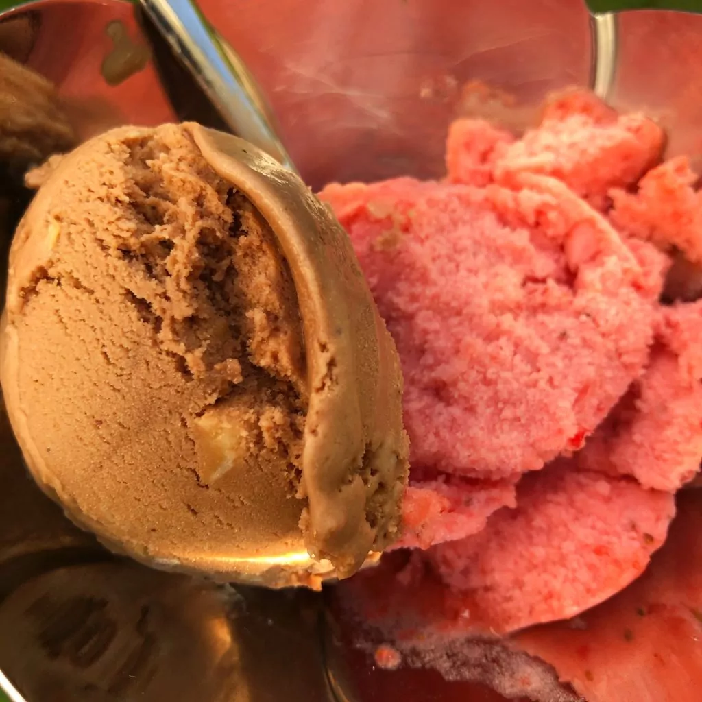 Una refrescante mezcla para tus días de vacaciones. Gelato Romano de Pistacho y Fresas sin azúcar.