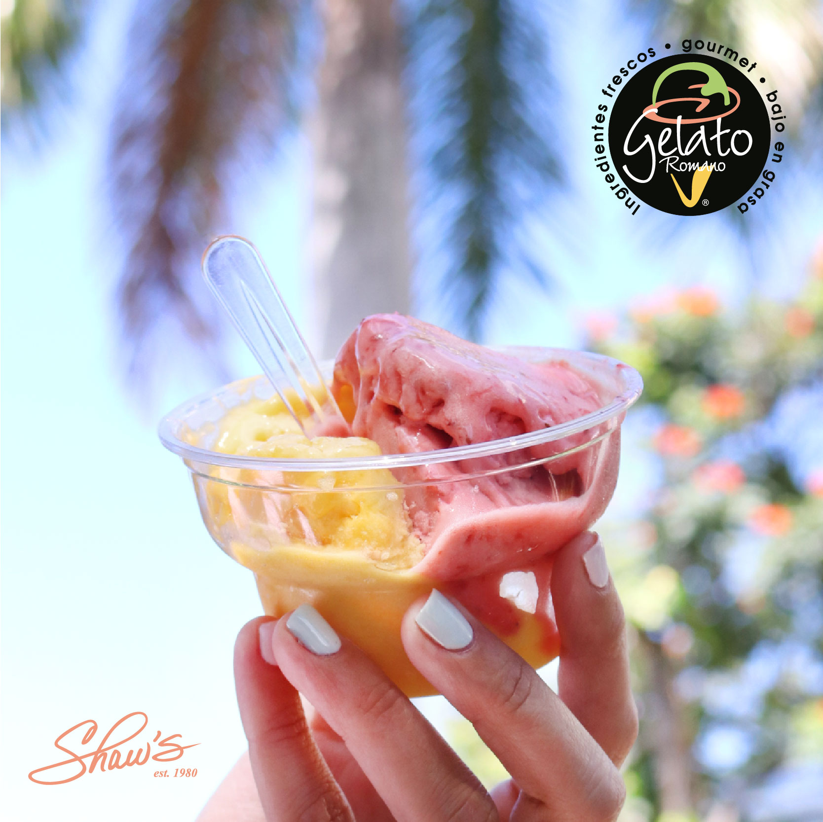 Refresca tus vacaciones agostinas con Gelato Romano de Shaw’s. 🍓🍨 Gelato elaborado con ingredientes frescos, gourmet y bajo en grasa. 🪬 🌴🥭