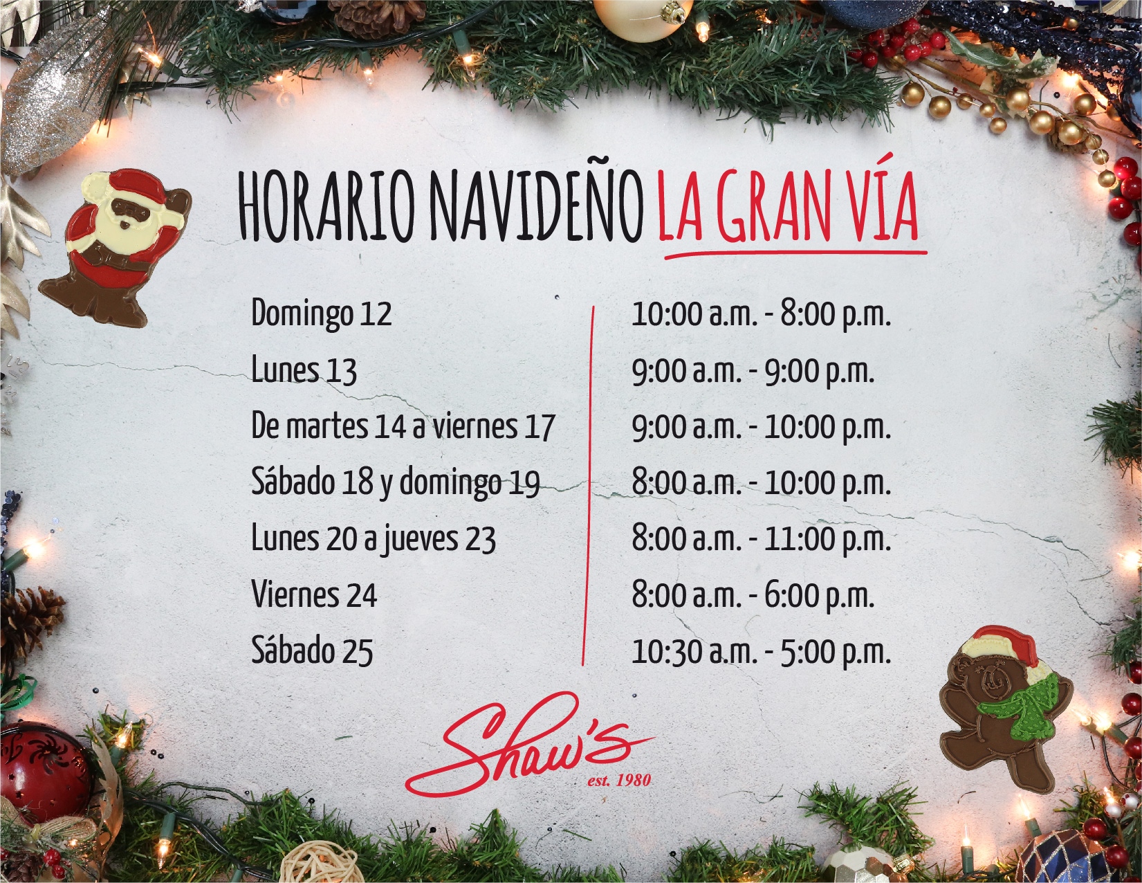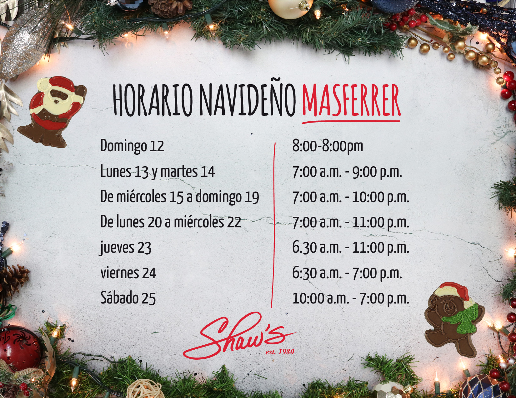Te compartimos el horario navideño de cada sucursal Shaw’s, aplicable a partir del 12 hasta el 25 de diciembre. 🎄📆✨