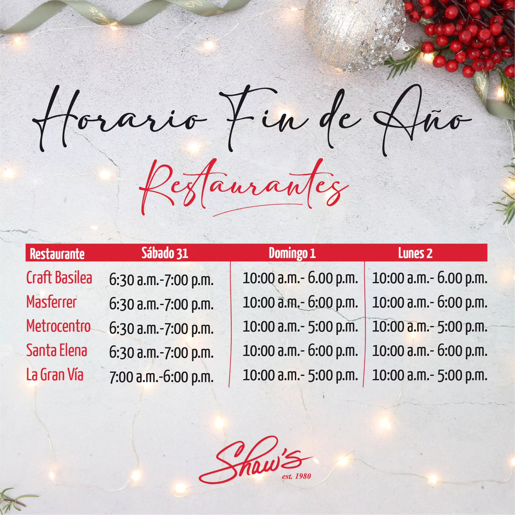 Vamos preparándonos para las celebraciones de Fin de Año, para ello te compartimos nuestros horarios del 31 de Dic. al 2 de Enero.🎆🧨✨