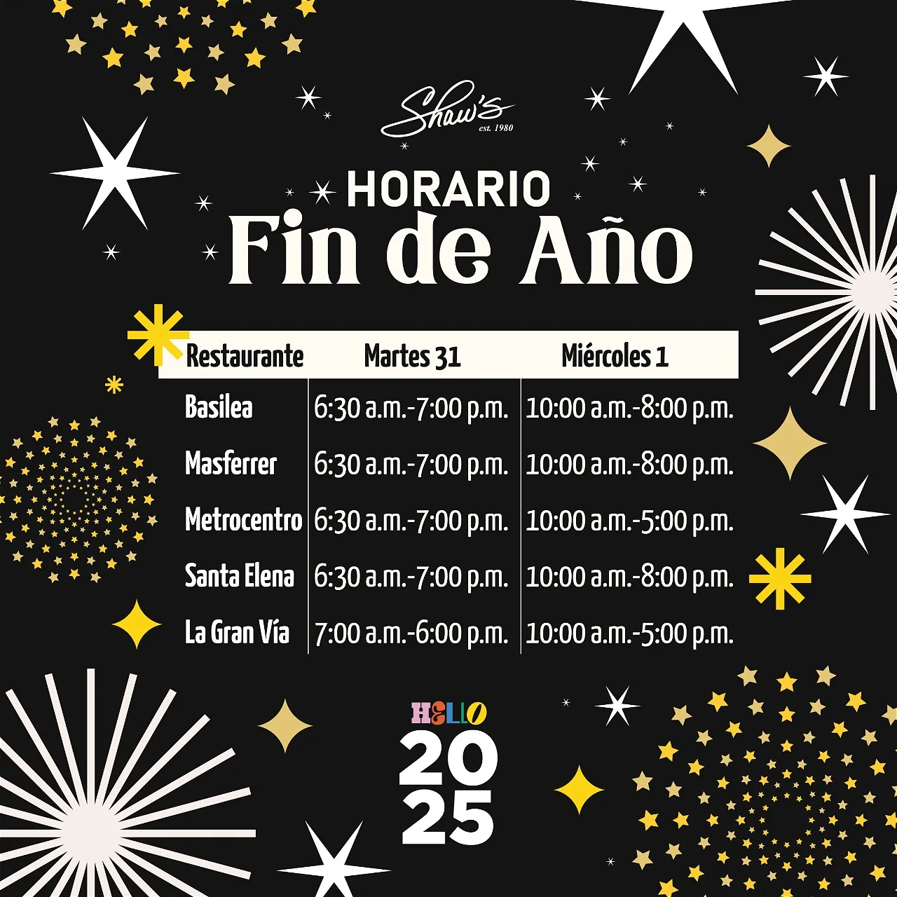 ✨ ¡La magia de fin de año está aquí! Consulta nuestros horarios especiales para acompañarte en estas fechas tan especiales. Estaremos abiertos el 31 de Dic. y el 1° de Enero. Cerramos el año con gratitud y comenzamos el 2025 listos para seguir compartiendo momentos inolvidables contigo. ¡Te esperamos!