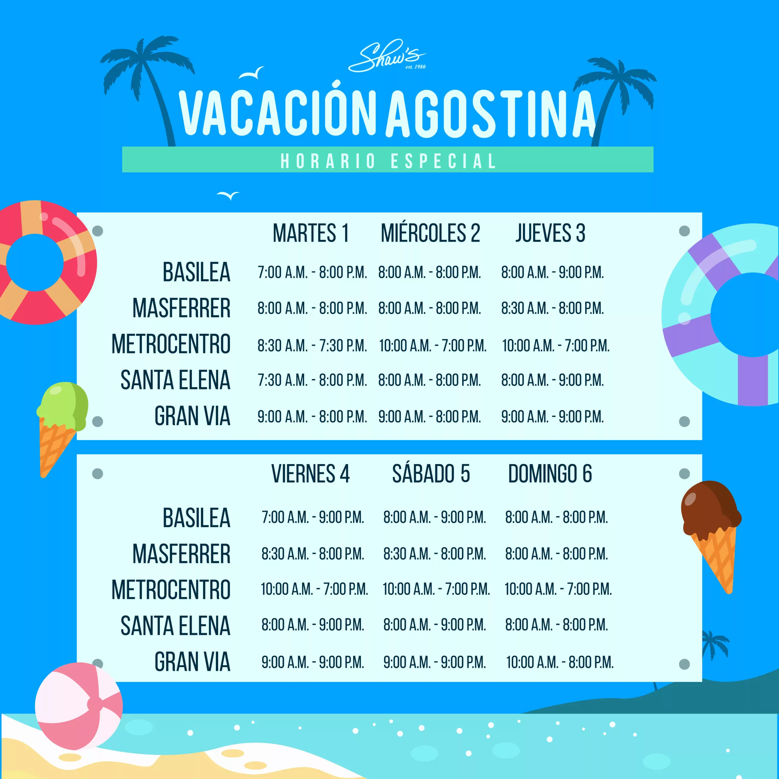 Te compartimos los horarios especiales de Shaw’s para la vacación agostina. ️️☕