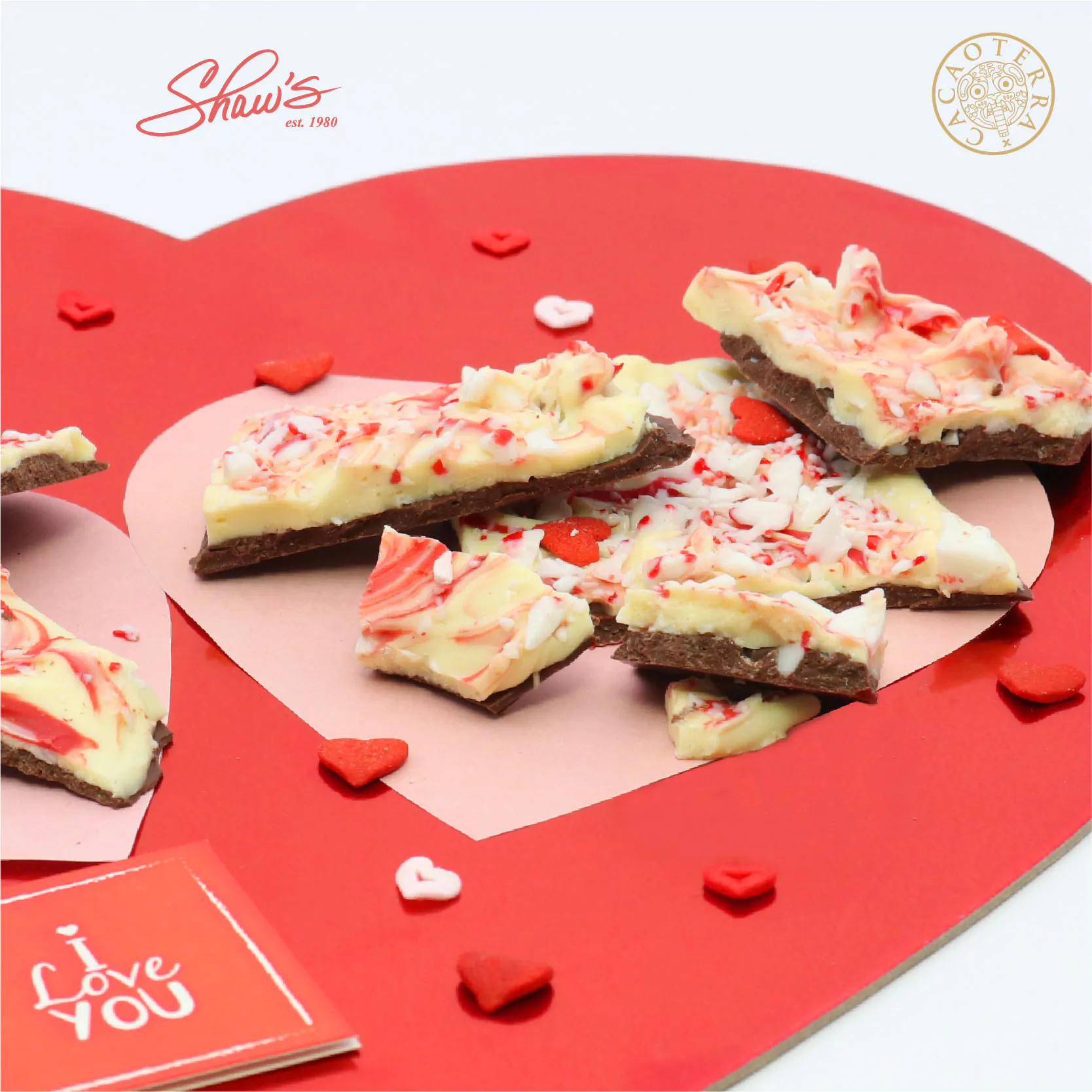 Lovely Bark ❤️💞 Bark de chocolate oscuro con chocolate blanco, menta y corazoncitos.
