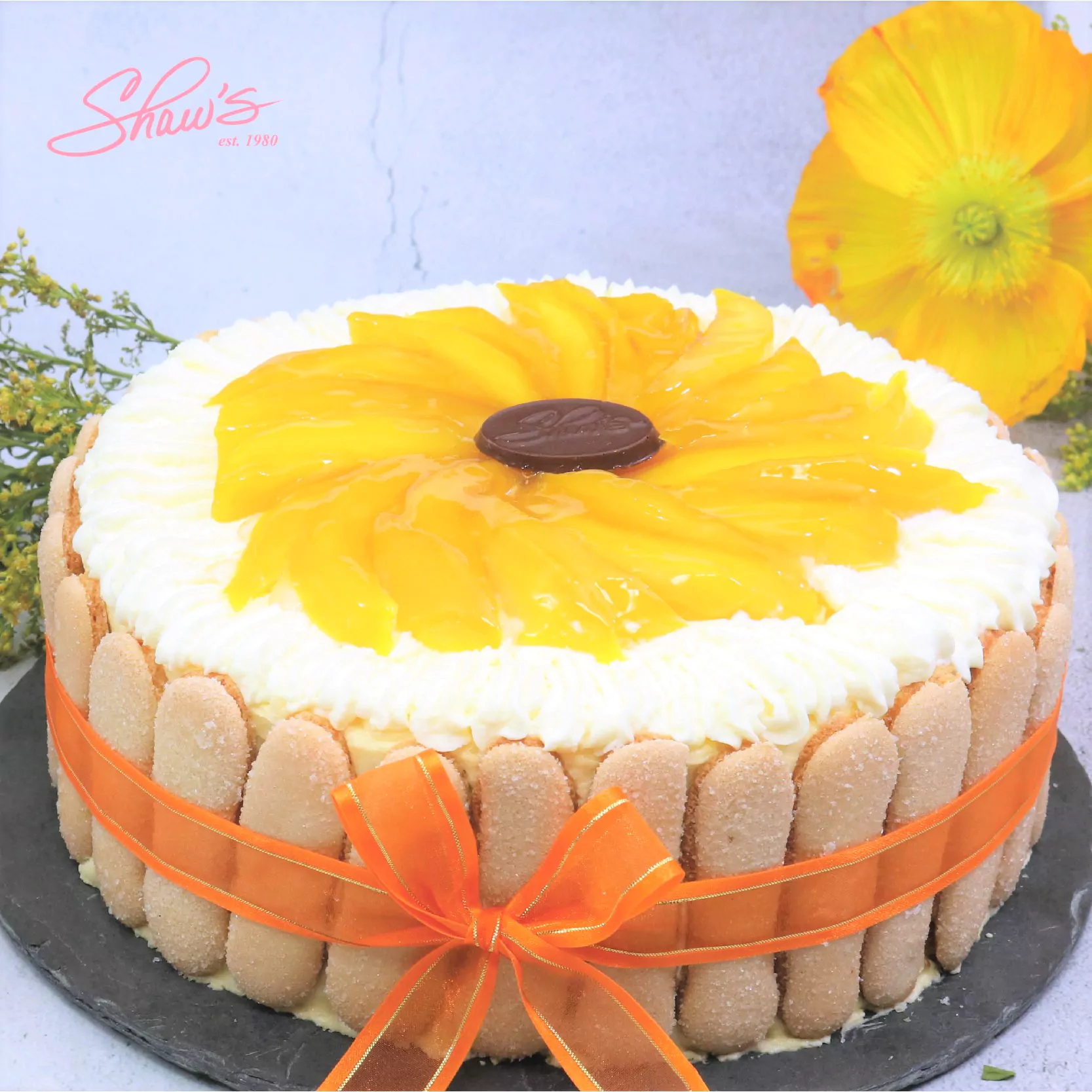 Mango Charlotte 💛🥭🧡 Rodajas de mango y crema devonshire sobre capas de pastel de vainilla y mousse de mango rodeados por suspiros.