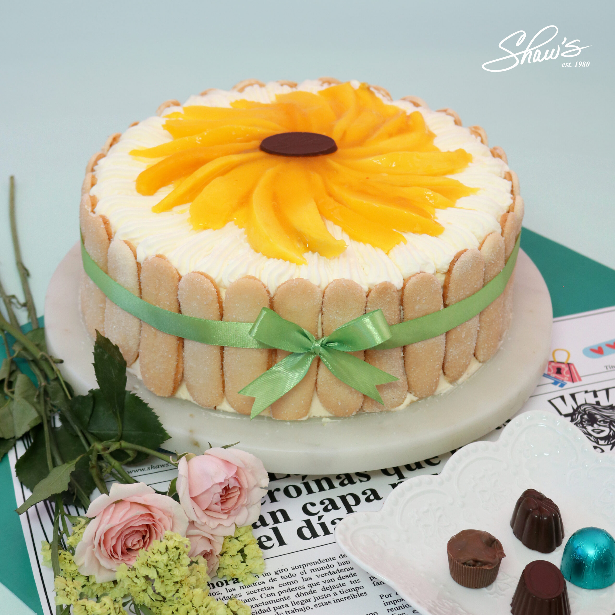 Mango Charlotte – Rodajas de mango y crema devonshire sobre capas de pastel de vainilla y mousse de mango, decorado con suspiros, para 12 a 15 porciones. Disponible del 9 al 11 de mayo, o por pedido especial para la fecha que desees, con 2 días hábiles de anticipación, en Shaw’s o nuestro website.