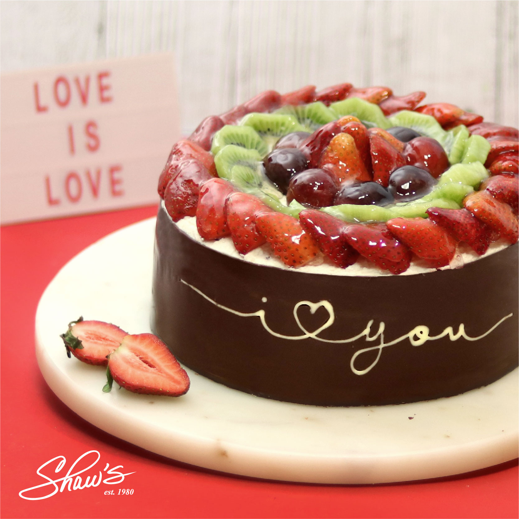 Mini Fantasía Valentine’s ❤️🥝¡Amor es compartir!🍓 Frutas tropicales sobre un relleno de crema y torta de chocolate, con un cincho de chocolate oscuro decorado.🍇🍫