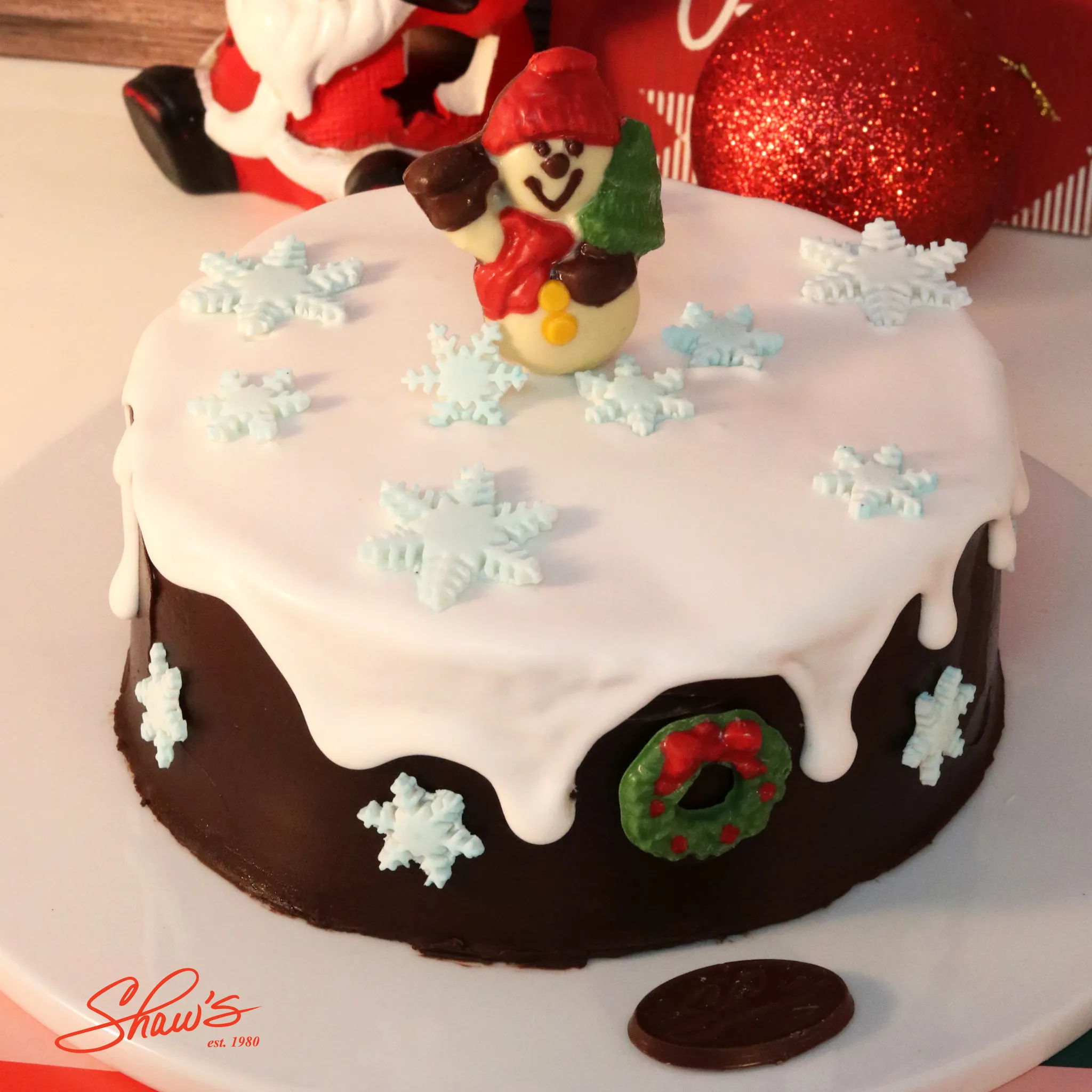 Mini Royal Navideño Deliciosa torta de chocolate con relleno de crema, cubierta de chocolate oscuro y decorada con figuras de chocolate y copos de nieve ❄️. ¡Perfecta para disfrutar en estas fiestas!