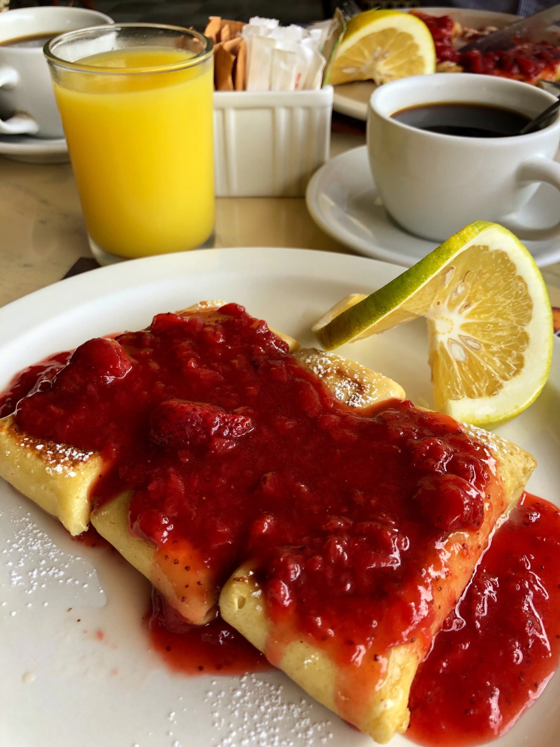 ☀️ NY Blintzes🍓Crepas rellenas de queso cottage con salsa fresca de fresas y miel maple 🍯 🍁 Acompañadas con jugo de naranja natural y café salvadoreño ☕️ Nada como consentirse para comenzar el día! 🍊😎 Disponibles en todas las tiendas Shaw’s, todo el día, todos los días!