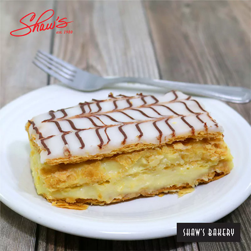 Napoleón 🤴🏻 ❣️ Capas de mil hojas (en masa hojaldre) con crema napoleón y bañada con fondant decorada con chocolate.☕