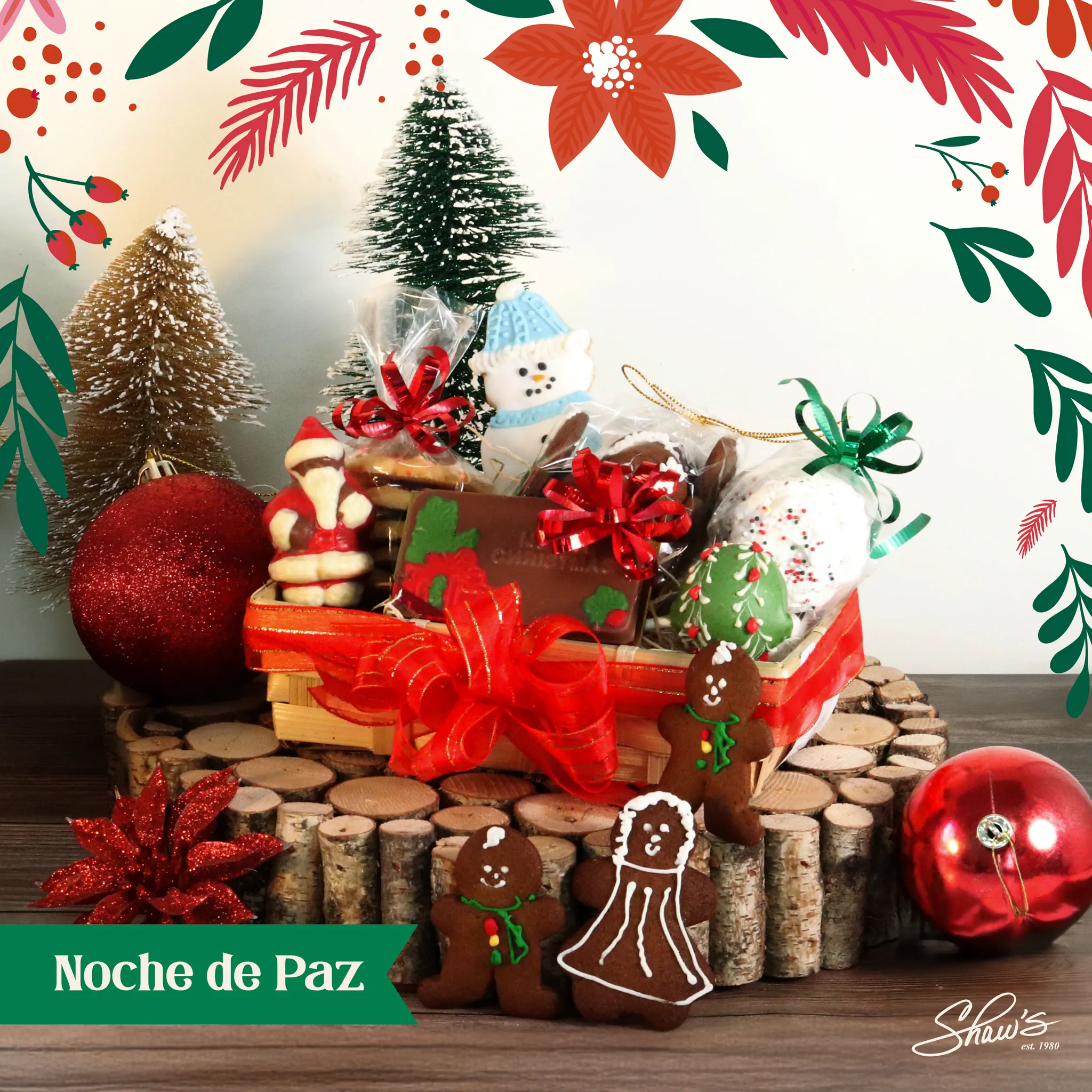 Sorprende con nuestra canasta Noche de Paz. El contenido de la canasta es: • Brownie pop; • Galleta Macaroons; • Galleta Spritz; • Tarjeta Merry Christmas de chocolate con leche; • Galleta de vainilla navideña; • Galletas pequeñas de jengibre; • Santa Claus pequeño de chocolate; • Canasta rectangular.