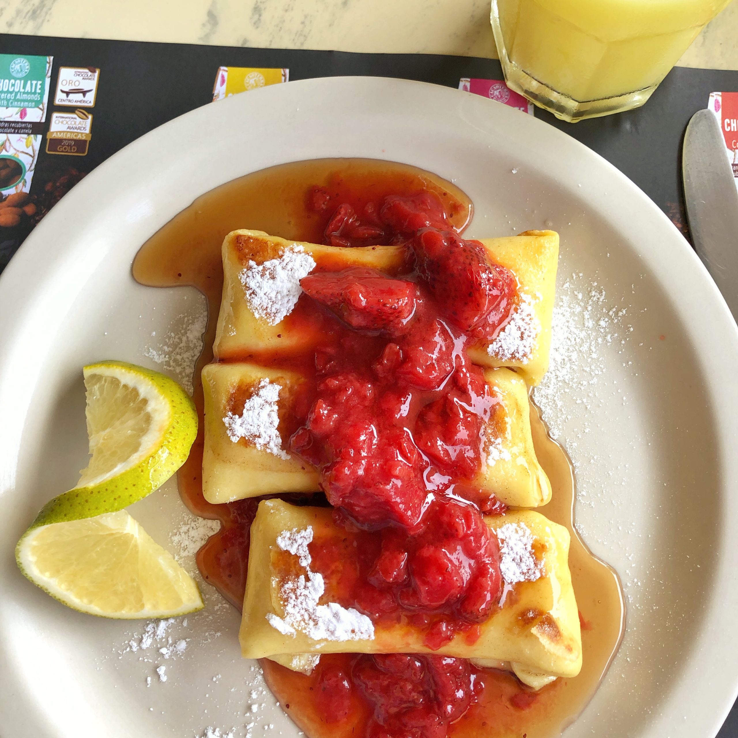 Crepitas rellenas de queso cottage con salsa de fresas naturales y miel maple 🍓🍯NY Cheese Blintzes son perfectas para cerrar la semana consintiéndote! 😍