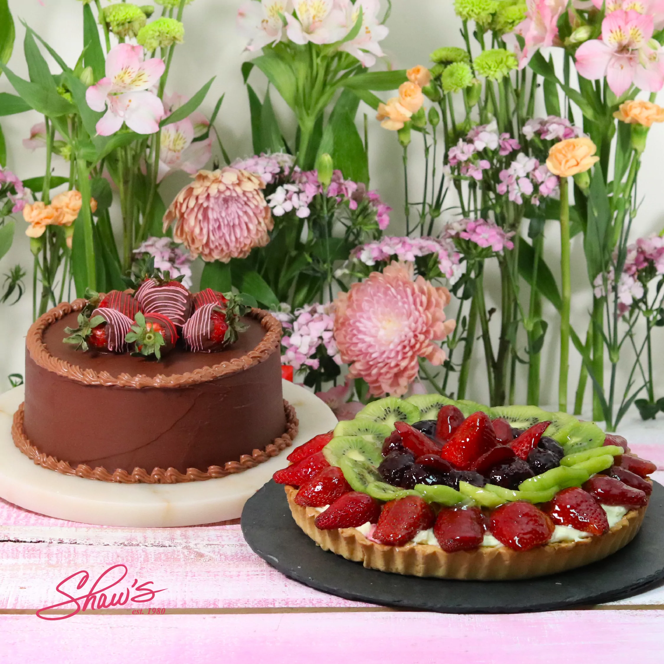 Chocolate Royal Mini con Fresas recubiertas de chocolate oscuro, y Tartaleta Festival de Frutas. Ordena en Shaw’s el pastel ideal para Mamá, o ven a elegirlo a Shaw’s el 9 y 10 de mayo.