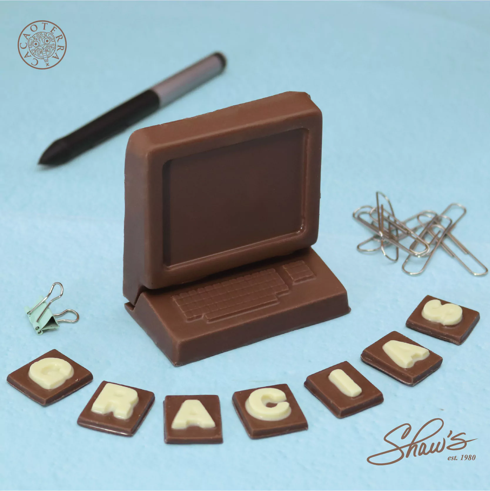 PC y mensaje hechos de chocolate con leche 41% cacao, y letras con chocolate blanco 30% cacao.💝