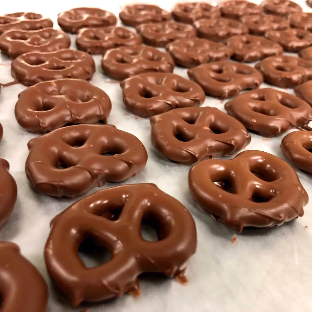 Crujientes pretzels bañados en chocolate con leche 41% cacao. 🥨🍫✨ ¡Chocolate Salvadoreño!