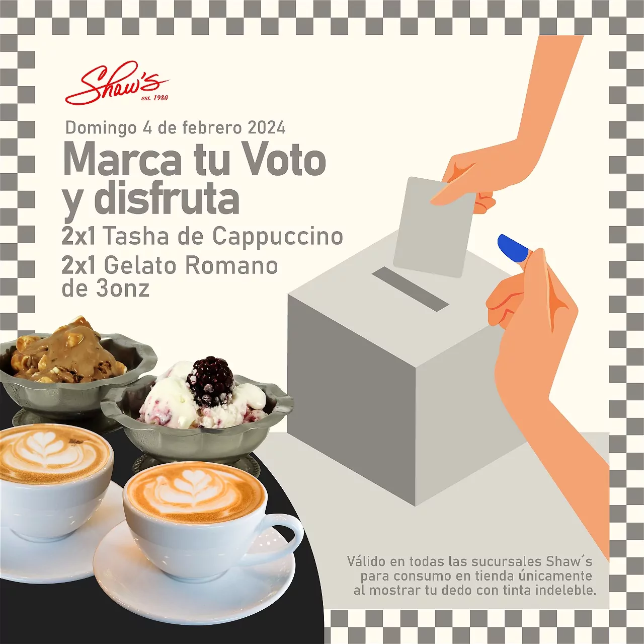 ¡Haz patria con tu voto este domingo 4 de febrero y disfruta de recompensas deliciosas! ️✨ Preséntanos tu dedo marcado con tinta indeleble y aprovecha las pomociones de 2×1 de Tasha Cappuccino (mediano) y 2×1 en Gelato Romano pequeño (3oz). ¡Cada voto cuenta y cada sabor es una celebración! ☕️