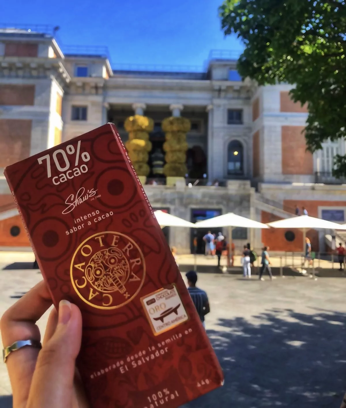 El sabor sublime de El Salvador se funde con la elegancia artística visitando el Museo Nacional del Prado y disfrutando nuestro exquisito chocolate oscuro 70% (Premiado ) . Delicadamente elaborado en tierras salvadoreñas, cada bocado despierta los sentidos y transporta al paladar a un viaje lleno de intensidad y satisfacción. Sumérgete en la riqueza cultural de Madrid mientras disfrutas de esta creación única que combina cacao y arte. ️