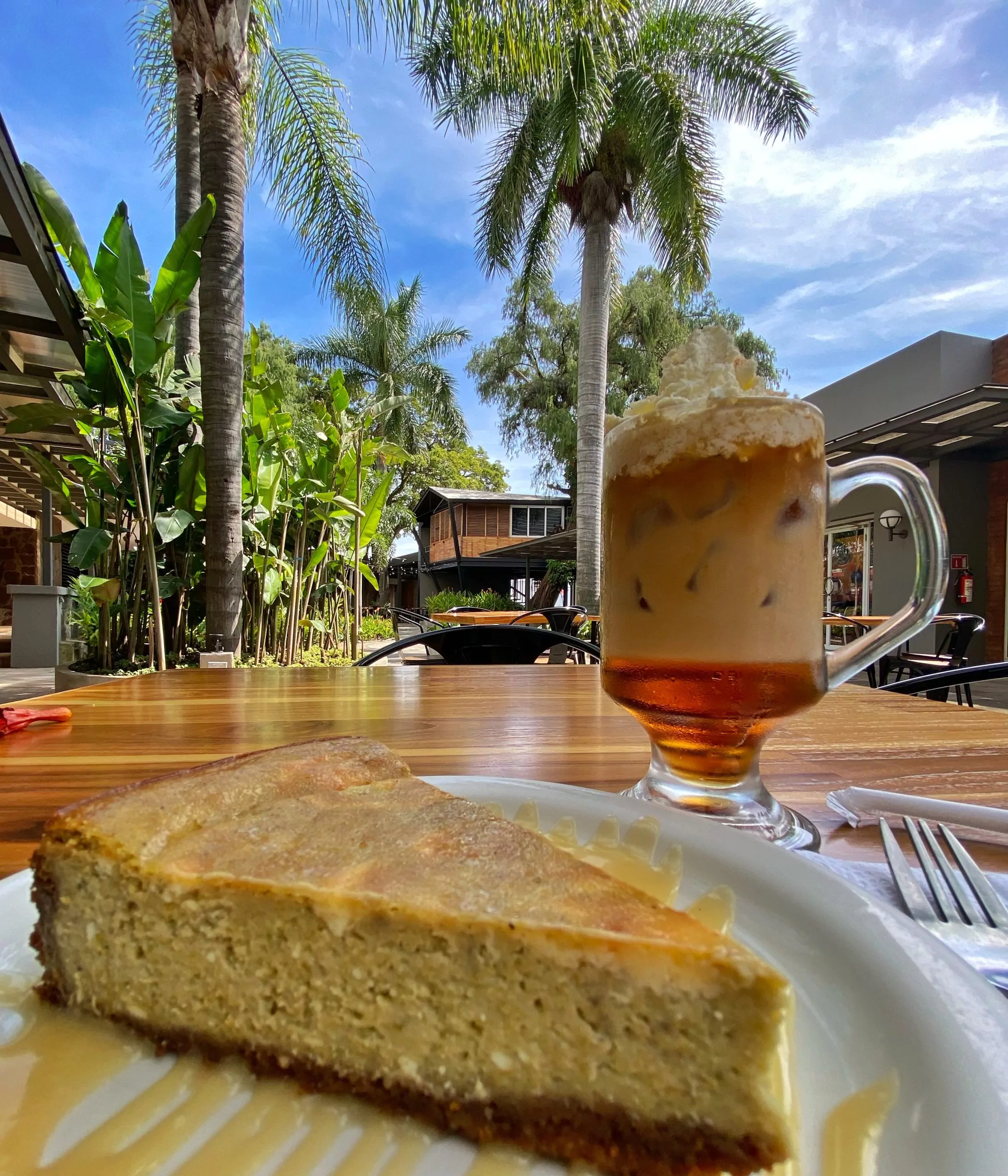 Pumpkin Cheesecake y Iced Cappuccino bajo las palmeras de Basilea. 🌴🎃💛💚