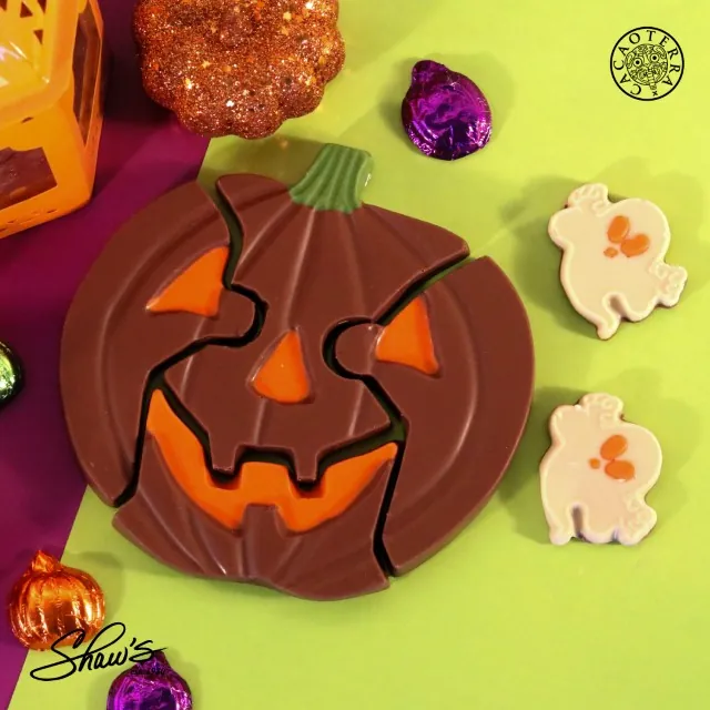 ¡Celebra Halloween desafiando tus habilidades con un rompecabezas de calabaza de chocolate y la compañía perfecta de fantasmitas de chocolate!