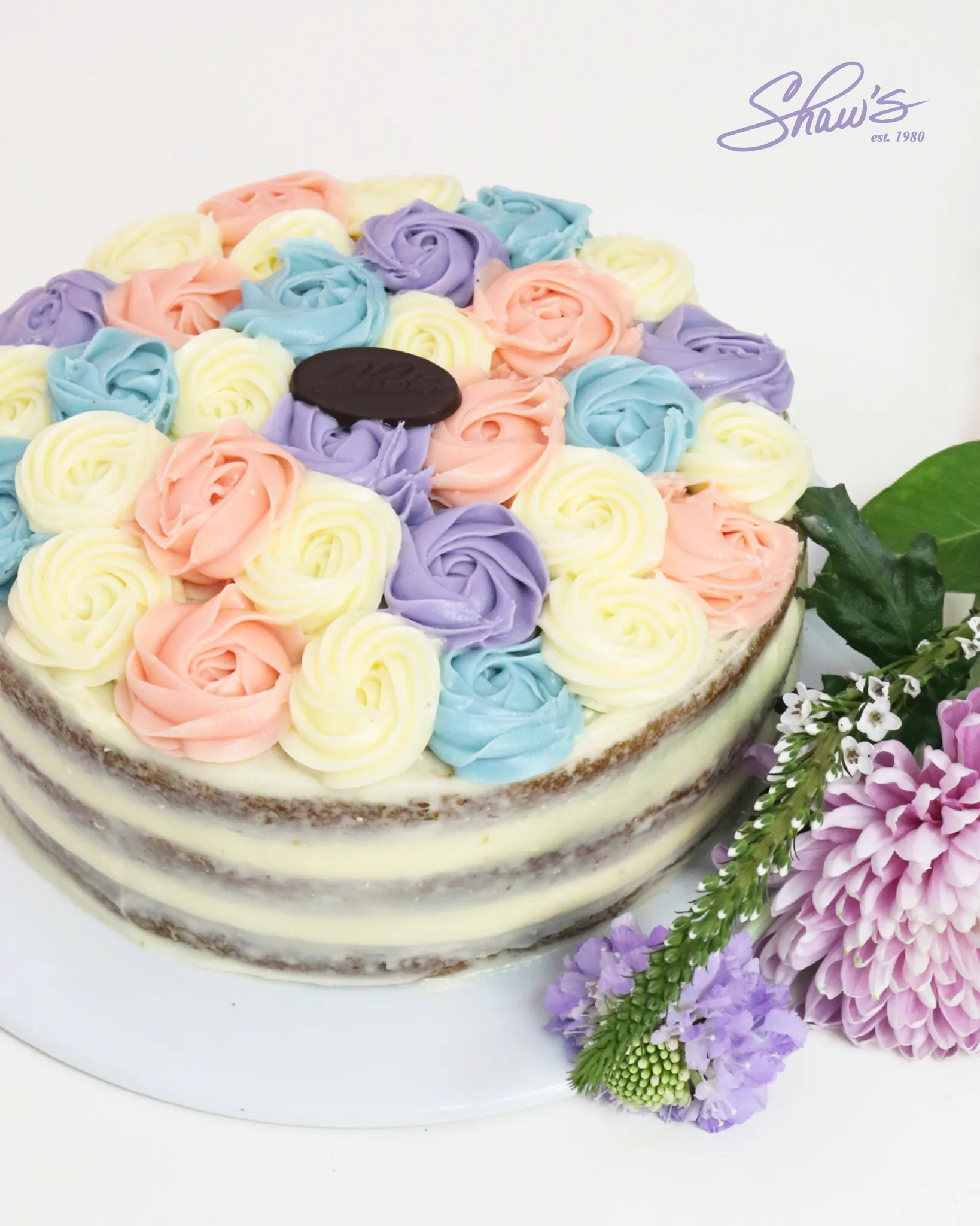 Rosal de Zanahoria Rosal de flores de betún de queso sobre nuestro aclamado pastel de zanahoria.