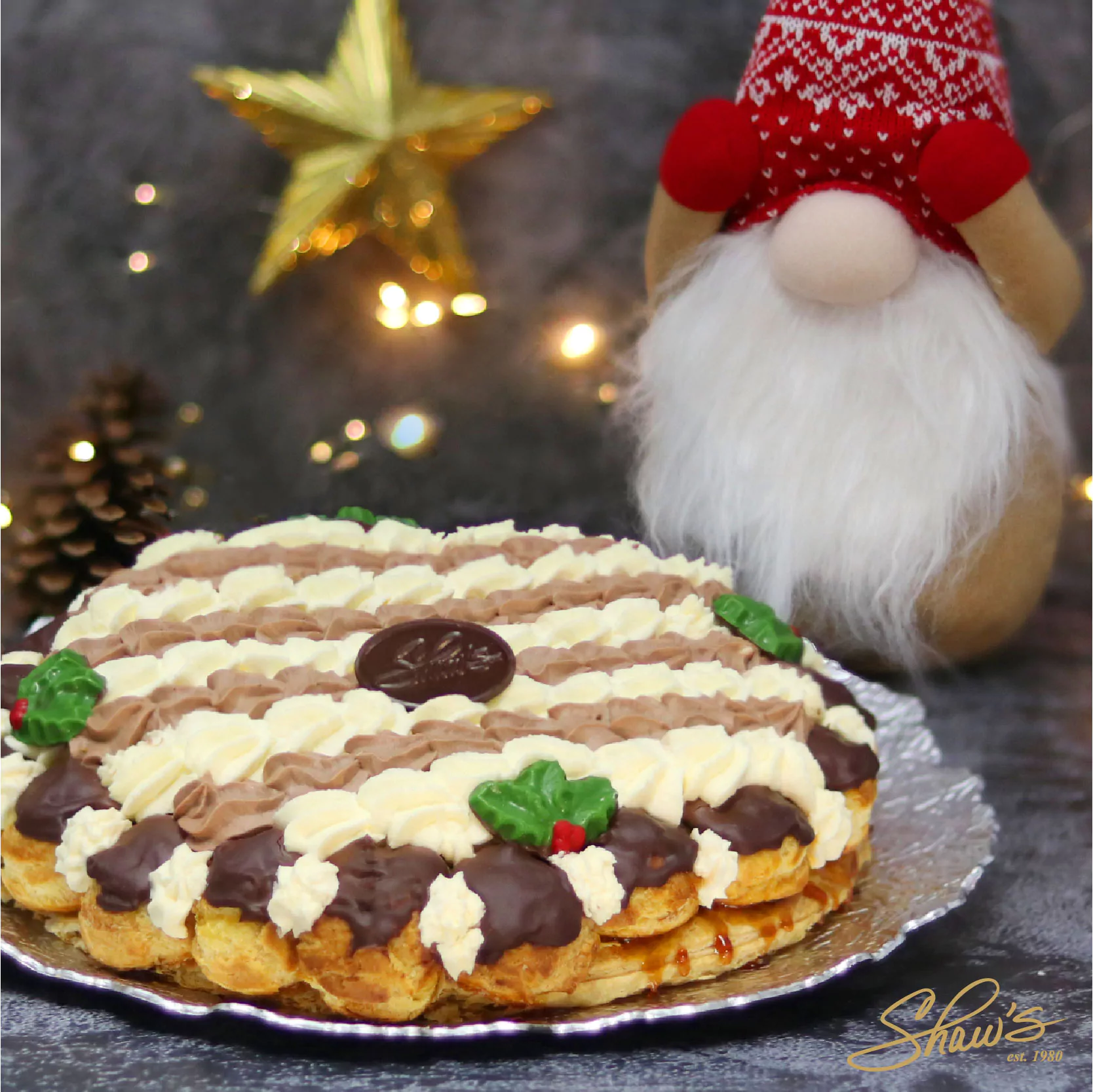 Saint Honoré ❣️🎄Corona de profiteroles bañados en chocolate oscuro 51% cacao, rellena de mousse de chocolate y crema chantilly sobre base de hojaldre, decorada con chocolate.✨