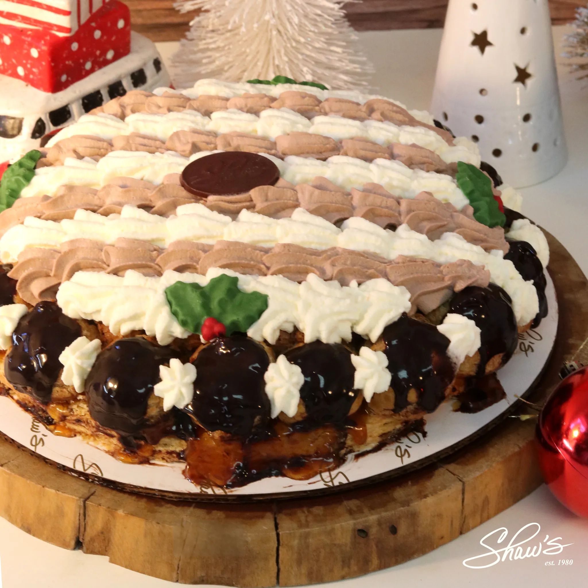 ✨ Déjate envolver por la magia de la Navidad con nuestro Saint Honoré: Corona de profiteroles bañados en chocolate oscuro, rellena de mousse de chocolate y crema chantilly sobre base de hojaldre, decorada con chocolate.