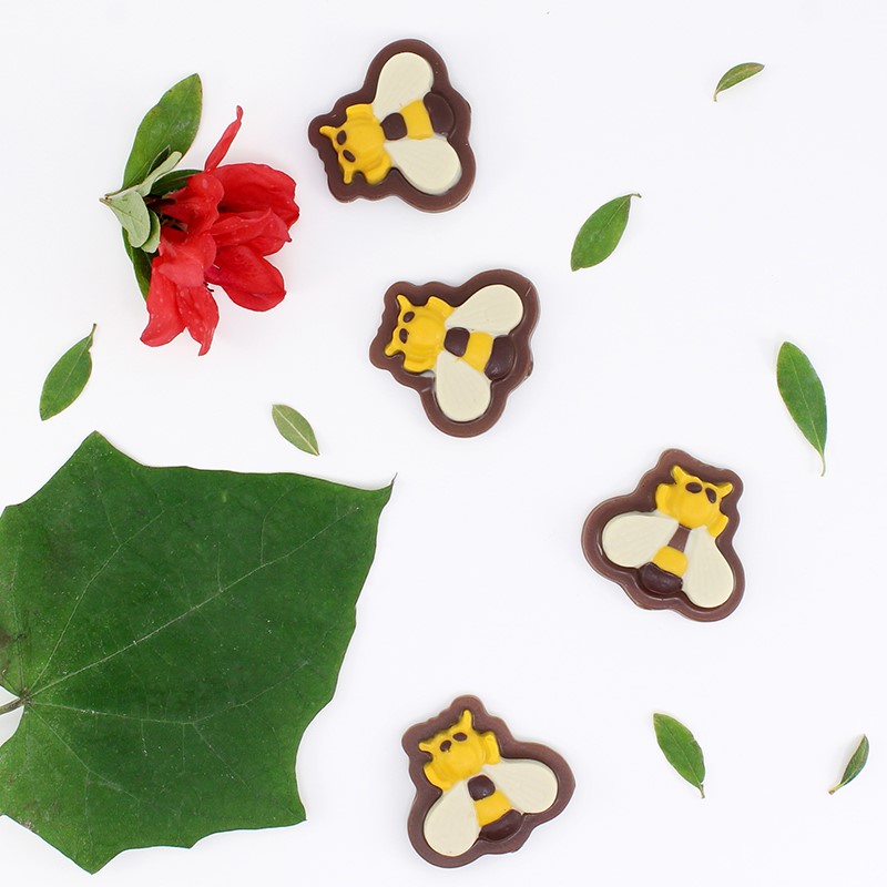 Abejitas de chocolate con leche 41% cacao, elaboradas a mano desde la semilla del cacao fino de aroma.