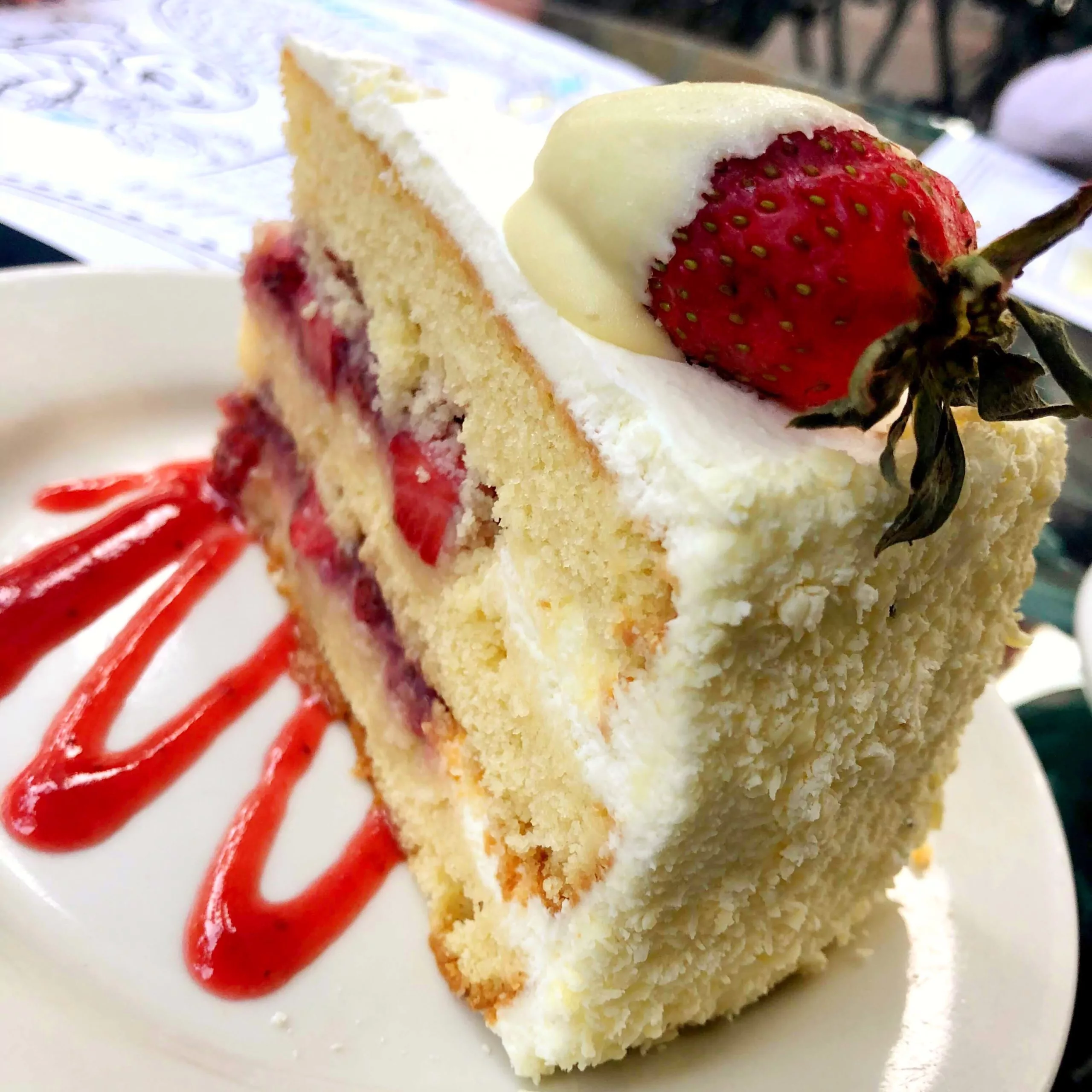 Consentirse es parte de relajarse el fin de semana 🍓Ven a Shaw’s por tu Selva Blanca🍰 una suave torta blanca con salsa de fresas frescas, con granizo de chocolate blanco y fresa bañada en chocolate blanco. ☕️ ¡Chocolate Blanco elaborado en El Salvador con cacao local, por @cacaoterra! 🌿