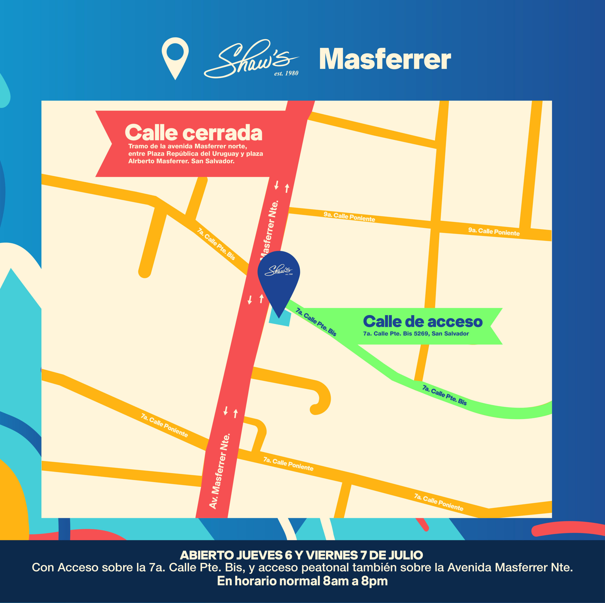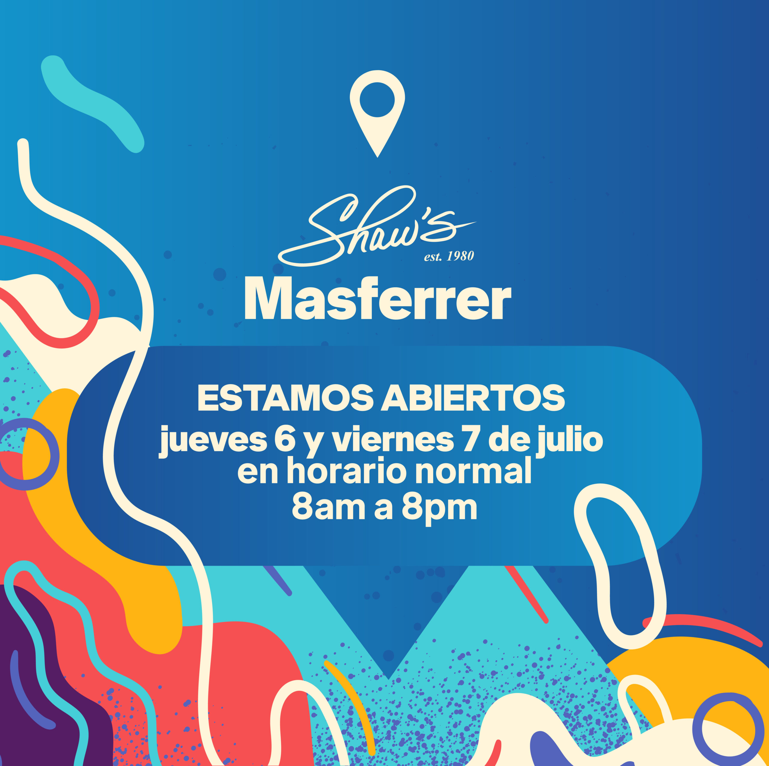A pesar de ciertos cierres de calles, te informamos que Shaw´s Masferrer estará abierto este jueves 6 y viernes 7 de julio en horario normal. ❤️