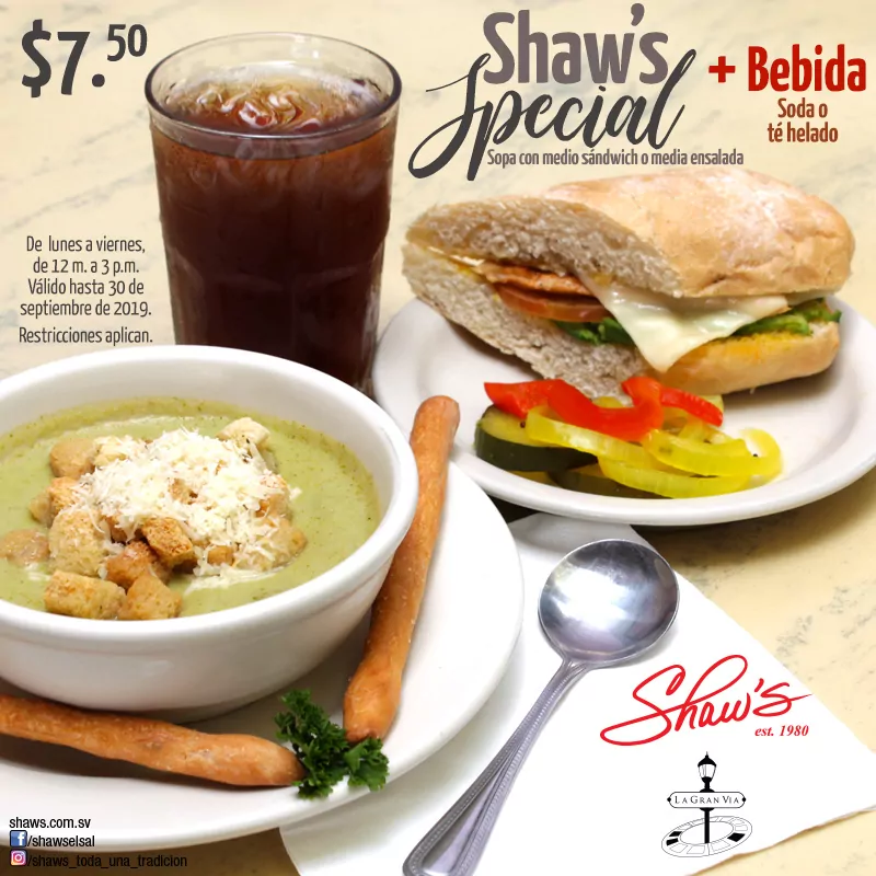 Disfruta tu Shaw’s Special 👉 Sopa o crema natural, y una media ensalada o medio sándwich (eliges el pan), con bebida incluida!🍹🍋 Te esperamos en Shaw’s @lagranviasv para comer como en casa, con ingredientes naturales, frescos y sin preservantes 🍵🥗🥪 Promoción válida hasta el 30 de septiembre!